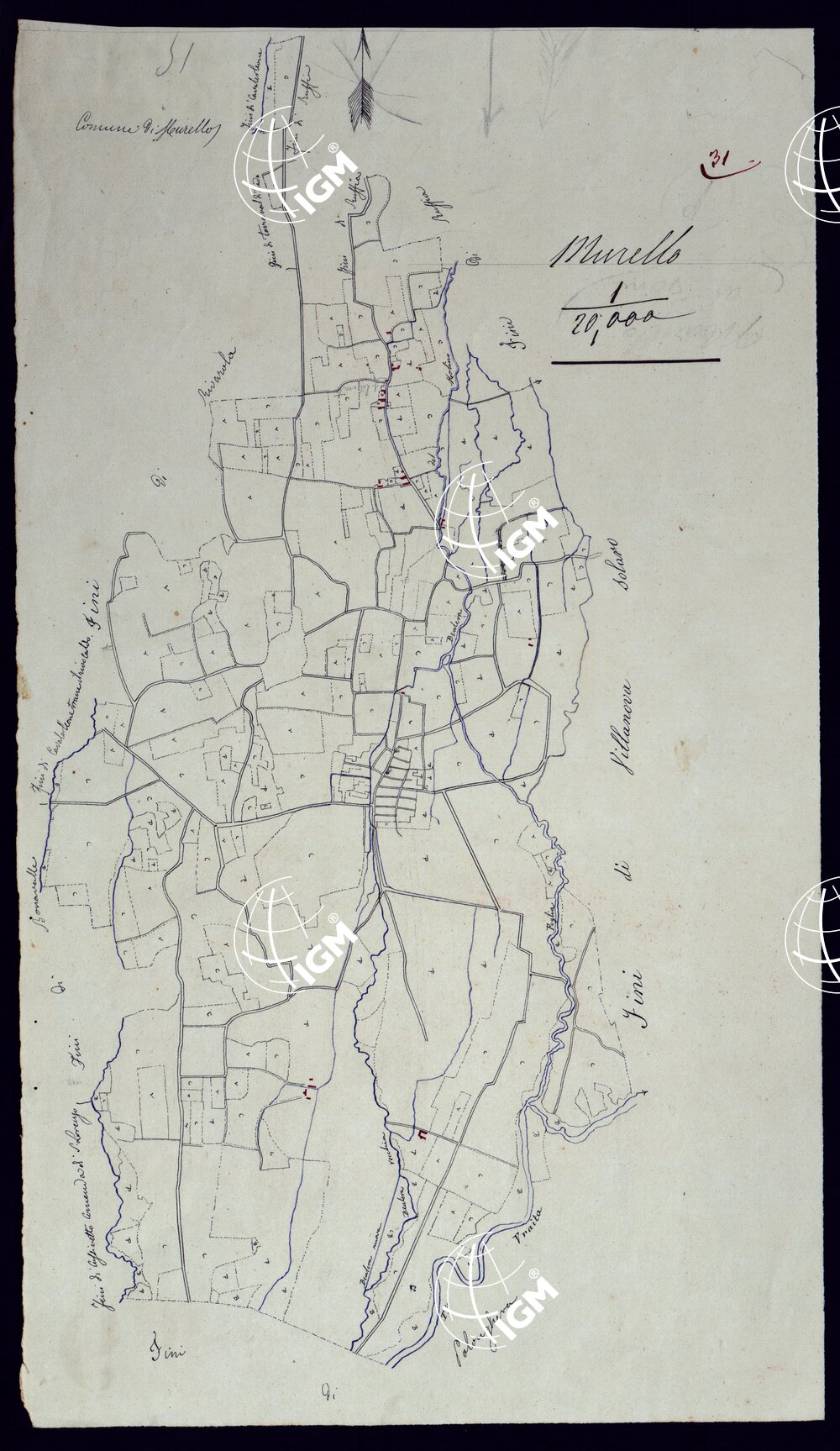 Gruppo di 51 mappe catastali di diversi comuni, impiegate con tutta probabilità per la costruzione della carta generale degli Stati Sardi al 50.000. Senza firma, eccetto due, firmate da Lagrange, una riduzione del piano catastale del territorio d’Ivrea firmato Valsecchi 1822, e una riproduzione dei piani catastali di comuni della provincia d’Ivrea firmata Cap. Roggero.
