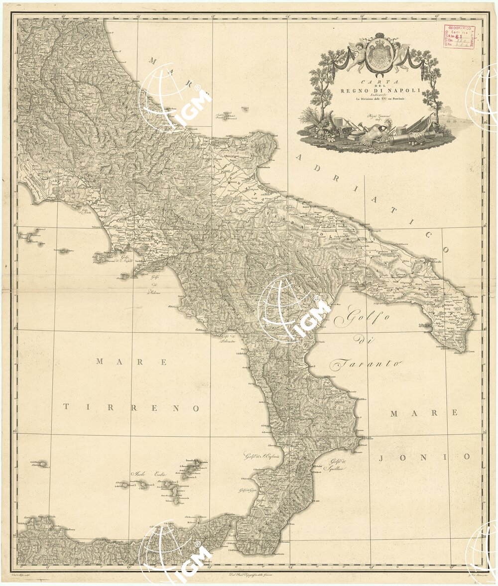 Carta in foglio unico incisa su rame, stampata in nero con confini politici a colori. In basso è scritto “Vinc.° Aloja scolpì” “Gio. di Pietro scrisse”. L’orografia vi è rappresentata con un sistema di ombreggiatura. Il territorio rappresentato si estende da Fossombrone a Sinigallia a nord, e a parte della Sicilia a sud. RIZZI ZANNONI 1807