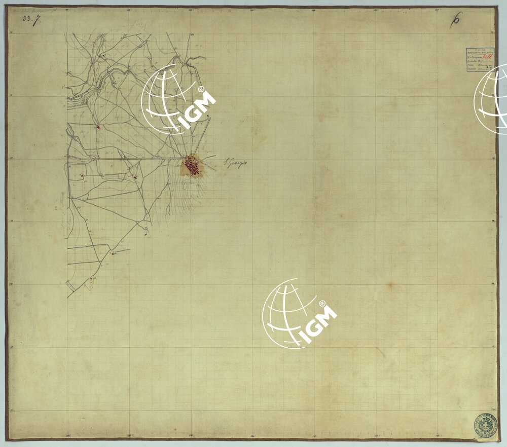 Sono 167 tavolette montate su tela o seta, copiate e messe in netto all’Officio Topografico di Napoli su le levate eseguite dal 1834 al 1860 per la formazione della Carta del Reame di Napoli alla scala di 1:80.000. L’esecuzione di questa carta venne decretata nel 1814: essa fu però iniziata, dati i movimenti politici di quell’epoca, soltanto nel 1833. Queste tavolette si riferiscono ai fogli 1, 5, 8, 9, 12, 13, 17-19, 28, 29, 33 della suddetta carta la quale doveva essere disegnata ed incisa su rame a bulino in fogli rettangolari con orografia a tratteggio e curve di livello tracciate alla equidistanza di 10 passi (m. 18,52) o di 52 passi (m. 92,60). Di essa peraltro furono pubblicati solamente cinque fogli, cioè: Napoli, Caserta, Gaeta, Leonessa, Cittaducale, tra il 1861 e 1870. L’I.G.M. conserva i rami dei primi tre di questi fogli. La carta all’80.000, pregevolissima per valore artistico e scientifico, venne giudicata superiore alle altre produzioni cartografiche contemporanee non solo italiane, ma europee (cfr. Mori A., La cartografia ufficiale in Italia e l’I.G.M. 1922, pag.107).