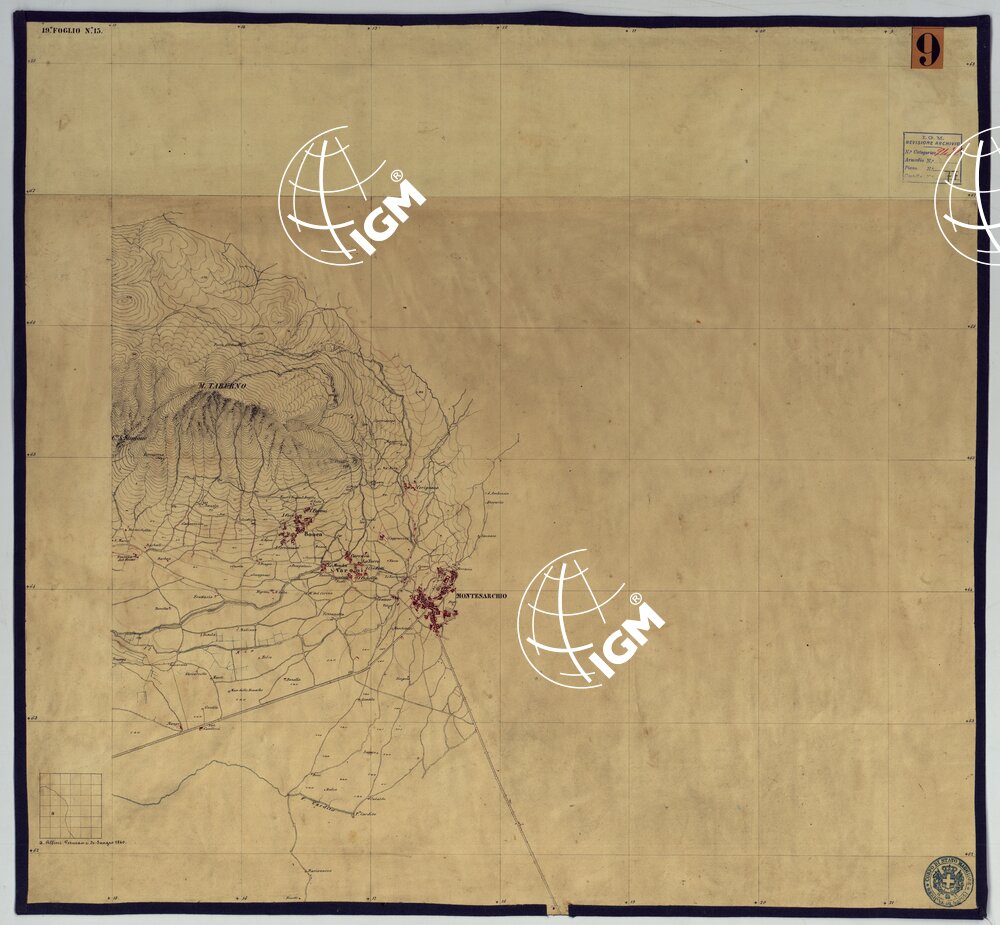 Sono 167 tavolette montate su tela o seta, copiate e messe in netto all’Officio Topografico di Napoli su le levate eseguite dal 1834 al 1860 per la formazione della Carta del Reame di Napoli alla scala di 1:80.000. L’esecuzione di questa carta venne decretata nel 1814: essa fu però iniziata, dati i movimenti politici di quell’epoca, soltanto nel 1833. Queste tavolette si riferiscono ai fogli 1, 5, 8, 9, 12, 13, 17-19, 28, 29, 33 della suddetta carta la quale doveva essere disegnata ed incisa su rame a bulino in fogli rettangolari con orografia a tratteggio e curve di livello tracciate alla equidistanza di 10 passi (m. 18,52) o di 52 passi (m. 92,60). Di essa peraltro furono pubblicati solamente cinque fogli, cioè: Napoli, Caserta, Gaeta, Leonessa, Cittaducale, tra il 1861 e 1870. L’I.G.M. conserva i rami dei primi tre di questi fogli. La carta all’80.000, pregevolissima per valore artistico e scientifico, venne giudicata superiore alle altre produzioni cartografiche contemporanee non solo italiane, ma europee (cfr. Mori A., La cartografia ufficiale in Italia e l’I.G.M. 1922, pag.107).