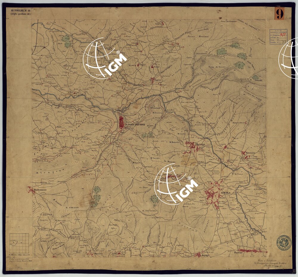 Sono 167 tavolette montate su tela o seta, copiate e messe in netto all’Officio Topografico di Napoli su le levate eseguite dal 1834 al 1860 per la formazione della Carta del Reame di Napoli alla scala di 1:80.000. L’esecuzione di questa carta venne decretata nel 1814: essa fu però iniziata, dati i movimenti politici di quell’epoca, soltanto nel 1833. Queste tavolette si riferiscono ai fogli 1, 5, 8, 9, 12, 13, 17-19, 28, 29, 33 della suddetta carta la quale doveva essere disegnata ed incisa su rame a bulino in fogli rettangolari con orografia a tratteggio e curve di livello tracciate alla equidistanza di 10 passi (m. 18,52) o di 52 passi (m. 92,60). Di essa peraltro furono pubblicati solamente cinque fogli, cioè: Napoli, Caserta, Gaeta, Leonessa, Cittaducale, tra il 1861 e 1870. L’I.G.M. conserva i rami dei primi tre di questi fogli. La carta all’80.000, pregevolissima per valore artistico e scientifico, venne giudicata superiore alle altre produzioni cartografiche contemporanee non solo italiane, ma europee (cfr. Mori A., La cartografia ufficiale in Italia e l’I.G.M. 1922, pag.107).