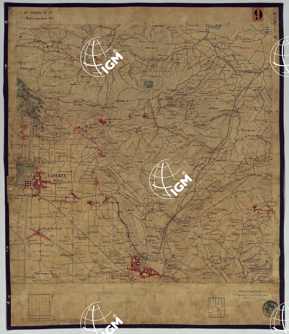 Sono 167 tavolette montate su tela o seta, copiate e messe in netto all’Officio Topografico di Napoli su le levate eseguite dal 1834 al 1860 per la formazione della Carta del Reame di Napoli alla scala di 1:80.000. L’esecuzione di questa carta venne decretata nel 1814: essa fu però iniziata, dati i movimenti politici di quell’epoca, soltanto nel 1833. Queste tavolette si riferiscono ai fogli 1, 5, 8, 9, 12, 13, 17-19, 28, 29, 33 della suddetta carta la quale doveva essere disegnata ed incisa su rame a bulino in fogli rettangolari con orografia a tratteggio e curve di livello tracciate alla equidistanza di 10 passi (m. 18,52) o di 52 passi (m. 92,60). Di essa peraltro furono pubblicati solamente cinque fogli, cioè: Napoli, Caserta, Gaeta, Leonessa, Cittaducale, tra il 1861 e 1870. L’I.G.M. conserva i rami dei primi tre di questi fogli. La carta all’80.000, pregevolissima per valore artistico e scientifico, venne giudicata superiore alle altre produzioni cartografiche contemporanee non solo italiane, ma europee (cfr. Mori A., La cartografia ufficiale in Italia e l’I.G.M. 1922, pag.107).