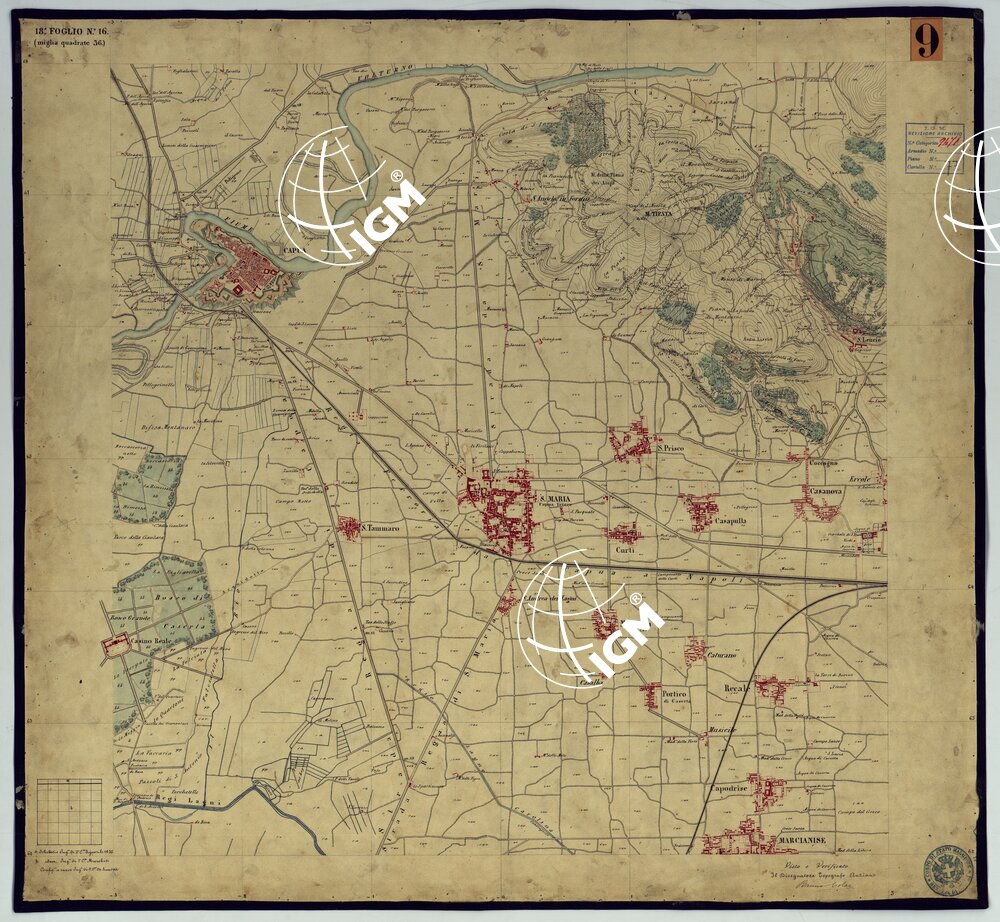 Sono 167 tavolette montate su tela o seta, copiate e messe in netto all’Officio Topografico di Napoli su le levate eseguite dal 1834 al 1860 per la formazione della Carta del Reame di Napoli alla scala di 1:80.000. L’esecuzione di questa carta venne decretata nel 1814: essa fu però iniziata, dati i movimenti politici di quell’epoca, soltanto nel 1833. Queste tavolette si riferiscono ai fogli 1, 5, 8, 9, 12, 13, 17-19, 28, 29, 33 della suddetta carta la quale doveva essere disegnata ed incisa su rame a bulino in fogli rettangolari con orografia a tratteggio e curve di livello tracciate alla equidistanza di 10 passi (m. 18,52) o di 52 passi (m. 92,60). Di essa peraltro furono pubblicati solamente cinque fogli, cioè: Napoli, Caserta, Gaeta, Leonessa, Cittaducale, tra il 1861 e 1870. L’I.G.M. conserva i rami dei primi tre di questi fogli. La carta all’80.000, pregevolissima per valore artistico e scientifico, venne giudicata superiore alle altre produzioni cartografiche contemporanee non solo italiane, ma europee (cfr. Mori A., La cartografia ufficiale in Italia e l’I.G.M. 1922, pag.107).