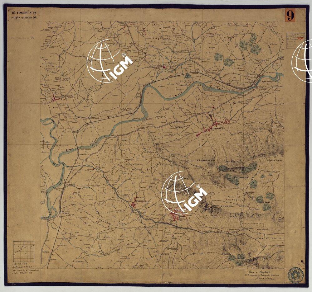 Sono 167 tavolette montate su tela o seta, copiate e messe in netto all’Officio Topografico di Napoli su le levate eseguite dal 1834 al 1860 per la formazione della Carta del Reame di Napoli alla scala di 1:80.000. L’esecuzione di questa carta venne decretata nel 1814: essa fu però iniziata, dati i movimenti politici di quell’epoca, soltanto nel 1833. Queste tavolette si riferiscono ai fogli 1, 5, 8, 9, 12, 13, 17-19, 28, 29, 33 della suddetta carta la quale doveva essere disegnata ed incisa su rame a bulino in fogli rettangolari con orografia a tratteggio e curve di livello tracciate alla equidistanza di 10 passi (m. 18,52) o di 52 passi (m. 92,60). Di essa peraltro furono pubblicati solamente cinque fogli, cioè: Napoli, Caserta, Gaeta, Leonessa, Cittaducale, tra il 1861 e 1870. L’I.G.M. conserva i rami dei primi tre di questi fogli. La carta all’80.000, pregevolissima per valore artistico e scientifico, venne giudicata superiore alle altre produzioni cartografiche contemporanee non solo italiane, ma europee (cfr. Mori A., La cartografia ufficiale in Italia e l’I.G.M. 1922, pag.107).