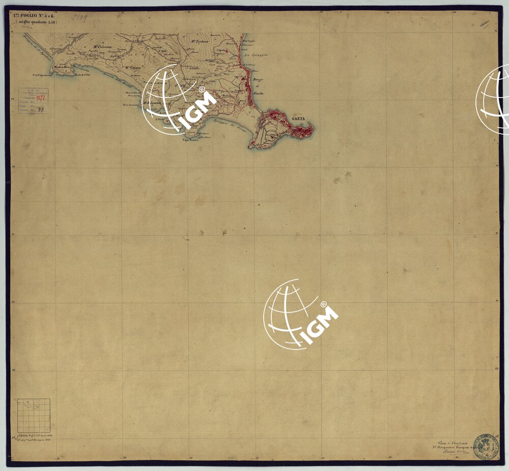 Sono 167 tavolette montate su tela o seta, copiate e messe in netto all’Officio Topografico di Napoli su le levate eseguite dal 1834 al 1860 per la formazione della Carta del Reame di Napoli alla scala di 1:80.000. L’esecuzione di questa carta venne decretata nel 1814: essa fu però iniziata, dati i movimenti politici di quell’epoca, soltanto nel 1833. Queste tavolette si riferiscono ai fogli 1, 5, 8, 9, 12, 13, 17-19, 28, 29, 33 della suddetta carta la quale doveva essere disegnata ed incisa su rame a bulino in fogli rettangolari delle dimensioni di m. 0,55×0,82, con orografia a tratteggio e curve di livello tracciate alla equidistanza di 10 passi (m. 18,52) o di 52 passi (m. 92,60). Di essa peraltro furono pubblicati solamente cinque fogli, cioè: Napoli, Caserta, Gaeta, Leonessa, Cittaducale, tra il 1861 e 1870. L’I.G.M. conserva i rami dei primi tre di questi fogli. La carta all’80.000, pregevolissima per valore artistico e scientifico, venne giudicata superiore alle altre produzioni cartografiche contemporanee non solo italiane, ma europee (cfr. Mori A., La cartografia ufficiale in Italia e l’I.G.M. 1922, pag.107).