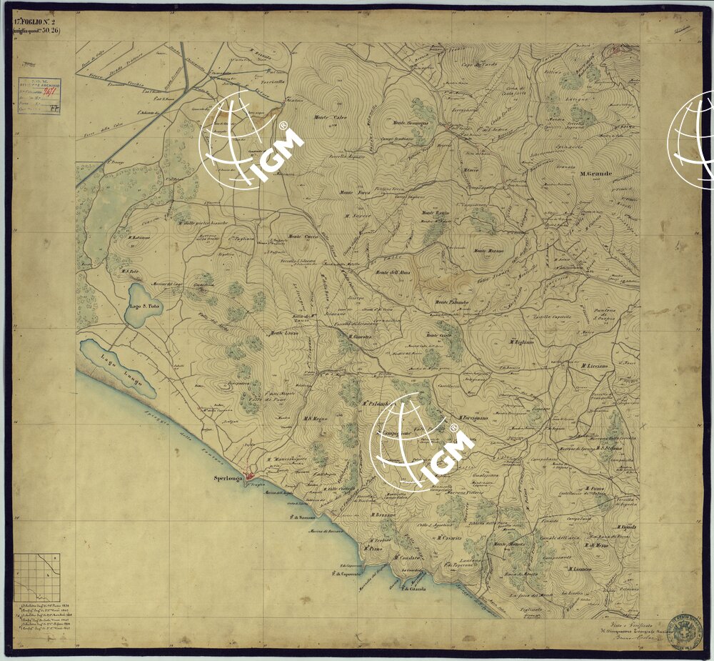 Sono 167 tavolette montate su tela o seta, copiate e messe in netto all’Officio Topografico di Napoli su le levate eseguite dal 1834 al 1860 per la formazione della Carta del Reame di Napoli alla scala di 1:80.000. L’esecuzione di questa carta venne decretata nel 1814: essa fu però iniziata, dati i movimenti politici di quell’epoca, soltanto nel 1833. Queste tavolette si riferiscono ai fogli 1, 5, 8, 9, 12, 13, 17-19, 28, 29, 33 della suddetta carta la quale doveva essere disegnata ed incisa su rame a bulino in fogli rettangolari con orografia a tratteggio e curve di livello tracciate alla equidistanza di 10 passi (m. 18,52) o di 52 passi (m. 92,60). Di essa peraltro furono pubblicati solamente cinque fogli, cioè: Napoli, Caserta, Gaeta, Leonessa, Cittaducale, tra il 1861 e 1870. L’I.G.M. conserva i rami dei primi tre di questi fogli. La carta all’80.000, pregevolissima per valore artistico e scientifico, venne giudicata superiore alle altre produzioni cartografiche contemporanee non solo italiane, ma europee (cfr. Mori A., La cartografia ufficiale in Italia e l’I.G.M. 1922, pag.107).