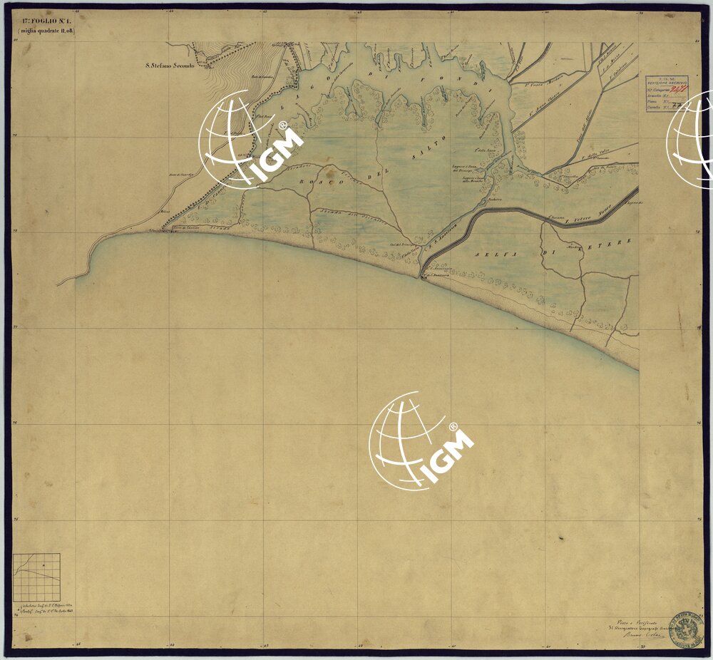 Sono 167 tavolette montate su tela o seta, copiate e messe in netto all’Officio Topografico di Napoli su le levate eseguite dal 1834 al 1860 per la formazione della Carta del Reame di Napoli alla scala di 1:80.000. L’esecuzione di questa carta venne decretata nel 1814: essa fu però iniziata, dati i movimenti politici di quell’epoca, soltanto nel 1833. Queste tavolette si riferiscono ai fogli 1, 5, 8, 9, 12, 13, 17-19, 28, 29, 33 della suddetta carta la quale doveva essere disegnata ed incisa su rame a bulino in fogli rettangolari con orografia a tratteggio e curve di livello tracciate alla equidistanza di 10 passi (m. 18,52) o di 52 passi (m. 92,60). Di essa peraltro furono pubblicati solamente cinque fogli, cioè: Napoli, Caserta, Gaeta, Leonessa, Cittaducale, tra il 1861 e 1870. L’I.G.M. conserva i rami dei primi tre di questi fogli. La carta all’80.000, pregevolissima per valore artistico e scientifico, venne giudicata superiore alle altre produzioni cartografiche contemporanee non solo italiane, ma europee (cfr. Mori A., La cartografia ufficiale in Italia e l’I.G.M. 1922, pag.107).