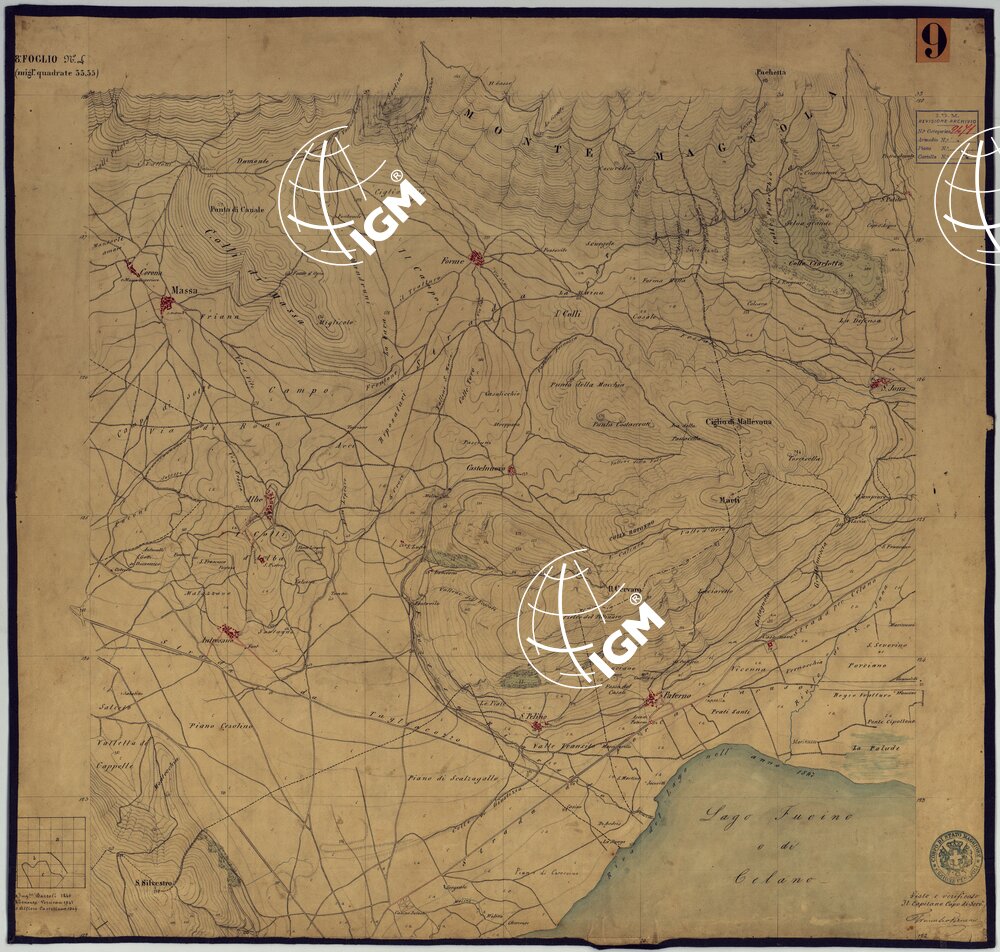 Sono 167 tavolette montate su tela o seta, copiate e messe in netto all’Officio Topografico di Napoli su le levate eseguite dal 1834 al 1860 per la formazione della Carta del Reame di Napoli alla scala di 1:80.000. L’esecuzione di questa carta venne decretata nel 1814: essa fu però iniziata, dati i movimenti politici di quell’epoca, soltanto nel 1833. Queste tavolette si riferiscono ai fogli 1, 5, 8, 9, 12, 13, 17-19, 28, 29, 33 della suddetta carta la quale doveva essere disegnata ed incisa su rame a bulino in fogli rettangolari con orografia a tratteggio e curve di livello tracciate alla equidistanza di 10 passi (m. 18,52) o di 52 passi (m. 92,60). Di essa peraltro furono pubblicati solamente cinque fogli, cioè: Napoli, Caserta, Gaeta, Leonessa, Cittaducale, tra il 1861 e 1870. L’I.G.M. conserva i rami dei primi tre di questi fogli. La carta all’80.000, pregevolissima per valore artistico e scientifico, venne giudicata superiore alle altre produzioni cartografiche contemporanee non solo italiane, ma europee (cfr. Mori A., La cartografia ufficiale in Italia e l’I.G.M. 1922, pag.107).