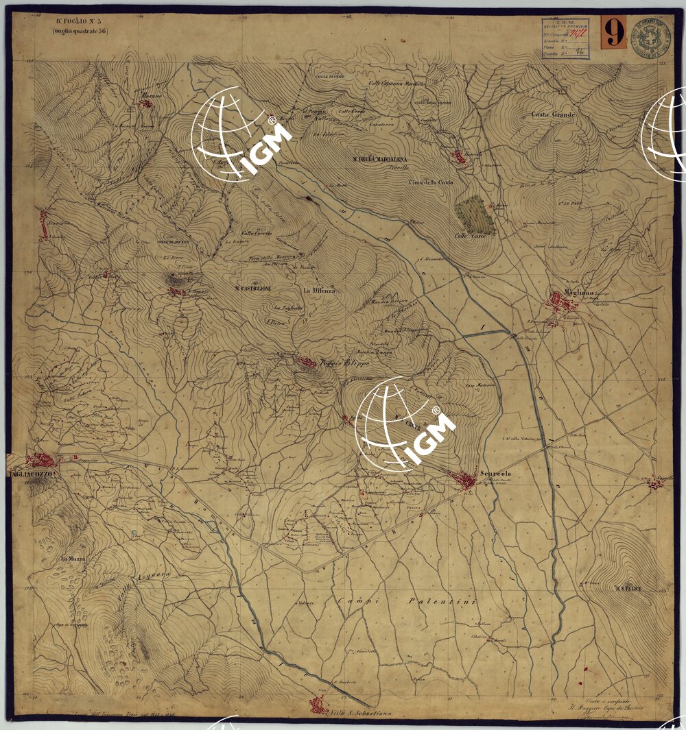 Sono 167 tavolette montate su tela o seta, copiate e messe in netto all’Officio Topografico di Napoli su le levate eseguite dal 1834 al 1860 per la formazione della Carta del Reame di Napoli alla scala di 1:80.000. L’esecuzione di questa carta venne decretata nel 1814: essa fu però iniziata, dati i movimenti politici di quell’epoca, soltanto nel 1833. Queste tavolette si riferiscono ai fogli 1, 5, 8, 9, 12, 13, 17-19, 28, 29, 33 della suddetta carta la quale doveva essere disegnata ed incisa su rame a bulino in fogli rettangolari con orografia a tratteggio e curve di livello tracciate alla equidistanza di 10 passi (m. 18,52) o di 52 passi (m. 92,60). Di essa peraltro furono pubblicati solamente cinque fogli, cioè: Napoli, Caserta, Gaeta, Leonessa, Cittaducale, tra il 1861 e 1870. L’I.G.M. conserva i rami dei primi tre di questi fogli. La carta all’80.000, pregevolissima per valore artistico e scientifico, venne giudicata superiore alle altre produzioni cartografiche contemporanee non solo italiane, ma europee (cfr. Mori A., La cartografia ufficiale in Italia e l’I.G.M. 1922, pag.107).