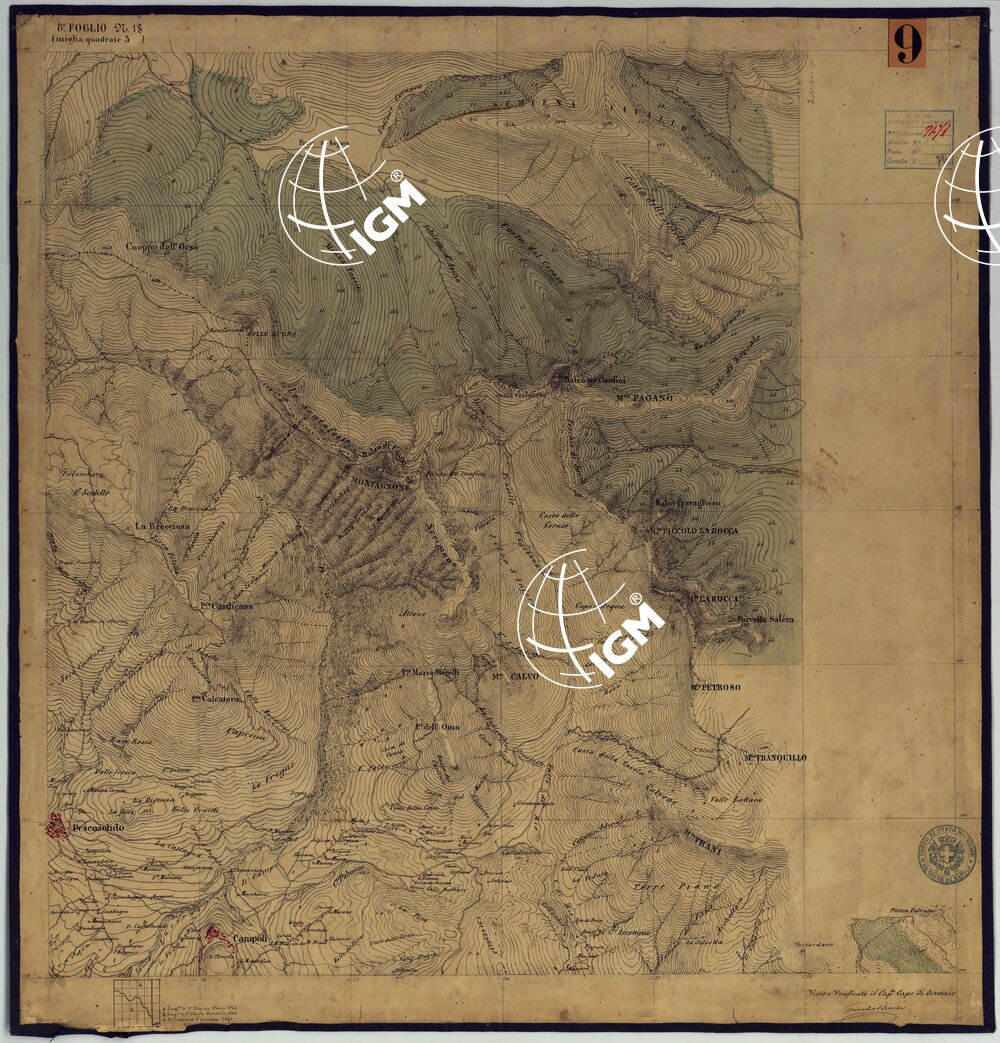 Sono 167 tavolette montate su tela o seta, copiate e messe in netto all’Officio Topografico di Napoli su le levate eseguite dal 1834 al 1860 per la formazione della Carta del Reame di Napoli alla scala di 1:80.000. L’esecuzione di questa carta venne decretata nel 1814: essa fu però iniziata, dati i movimenti politici di quell’epoca, soltanto nel 1833. Queste tavolette si riferiscono ai fogli 1, 5, 8, 9, 12, 13, 17-19, 28, 29, 33 della suddetta carta la quale doveva essere disegnata ed incisa su rame a bulino in fogli rettangolari con orografia a tratteggio e curve di livello tracciate alla equidistanza di 10 passi (m. 18,52) o di 52 passi (m. 92,60). Di essa peraltro furono pubblicati solamente cinque fogli, cioè: Napoli, Caserta, Gaeta, Leonessa, Cittaducale, tra il 1861 e 1870. L’I.G.M. conserva i rami dei primi tre di questi fogli. La carta all’80.000, pregevolissima per valore artistico e scientifico, venne giudicata superiore alle altre produzioni cartografiche contemporanee non solo italiane, ma europee (cfr. Mori A., La cartografia ufficiale in Italia e l’I.G.M. 1922, pag.107).