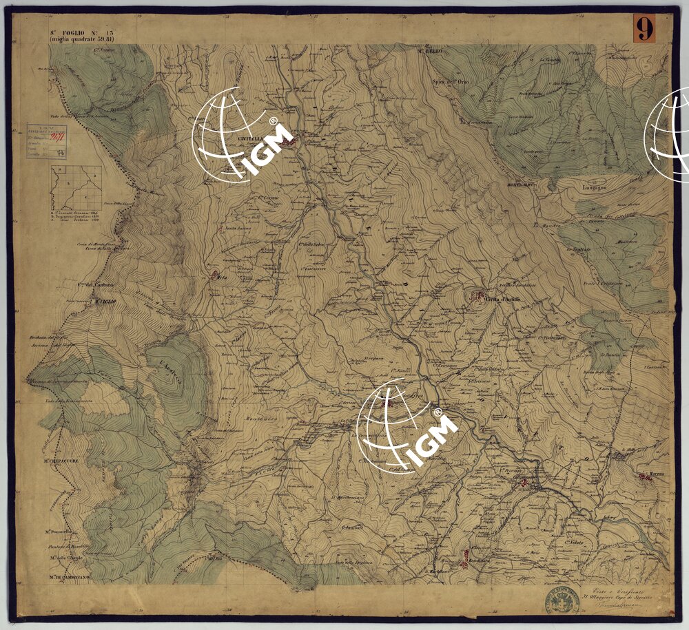 Sono 167 tavolette montate su tela o seta, copiate e messe in netto all’Officio Topografico di Napoli su le levate eseguite dal 1834 al 1860 per la formazione della Carta del Reame di Napoli alla scala di 1:80.000. L’esecuzione di questa carta venne decretata nel 1814: essa fu però iniziata, dati i movimenti politici di quell’epoca, soltanto nel 1833. Queste tavolette si riferiscono ai fogli 1, 5, 8, 9, 12, 13, 17-19, 28, 29, 33 della suddetta carta la quale doveva essere disegnata ed incisa su rame a bulino in fogli rettangolari con orografia a tratteggio e curve di livello tracciate alla equidistanza di 10 passi (m. 18,52) o di 52 passi (m. 92,60). Di essa peraltro furono pubblicati solamente cinque fogli, cioè: Napoli, Caserta, Gaeta, Leonessa, Cittaducale, tra il 1861 e 1870. L’I.G.M. conserva i rami dei primi tre di questi fogli. La carta all’80.000, pregevolissima per valore artistico e scientifico, venne giudicata superiore alle altre produzioni cartografiche contemporanee non solo italiane, ma europee (cfr. Mori A., La cartografia ufficiale in Italia e l’I.G.M. 1922, pag.107).