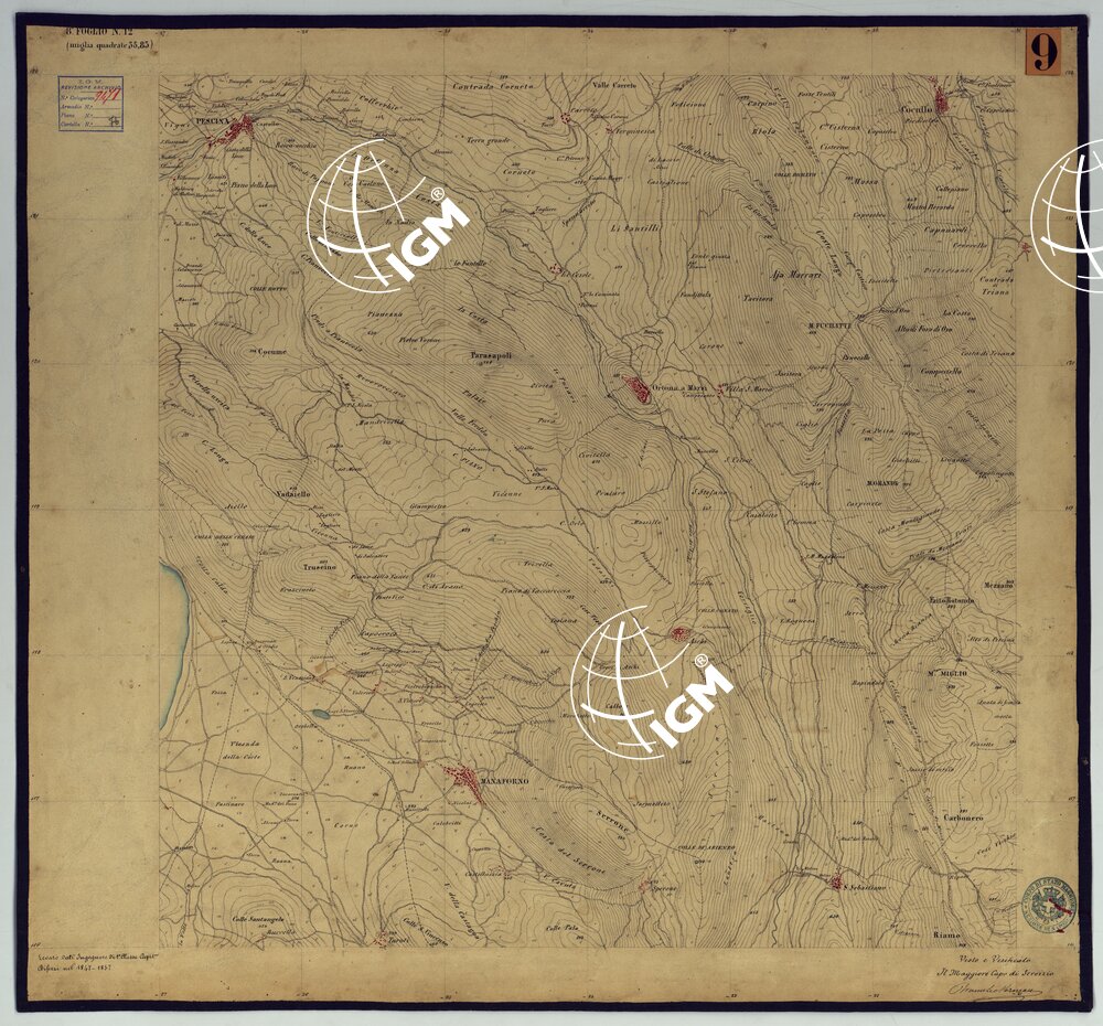 Sono 167 tavolette montate su tela o seta, copiate e messe in netto all’Officio Topografico di Napoli su le levate eseguite dal 1834 al 1860 per la formazione della Carta del Reame di Napoli alla scala di 1:80.000. L’esecuzione di questa carta venne decretata nel 1814: essa fu però iniziata, dati i movimenti politici di quell’epoca, soltanto nel 1833. Queste tavolette si riferiscono ai fogli 1, 5, 8, 9, 12, 13, 17-19, 28, 29, 33 della suddetta carta la quale doveva essere disegnata ed incisa su rame a bulino in fogli rettangolari con orografia a tratteggio e curve di livello tracciate alla equidistanza di 10 passi (m. 18,52) o di 52 passi (m. 92,60). Di essa peraltro furono pubblicati solamente cinque fogli, cioè: Napoli, Caserta, Gaeta, Leonessa, Cittaducale, tra il 1861 e 1870. L’I.G.M. conserva i rami dei primi tre di questi fogli. La carta all’80.000, pregevolissima per valore artistico e scientifico, venne giudicata superiore alle altre produzioni cartografiche contemporanee non solo italiane, ma europee (cfr. Mori A., La cartografia ufficiale in Italia e l’I.G.M. 1922, pag.107).