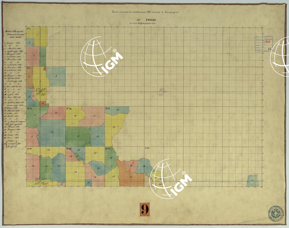 TAVOLETTE AL 20.000 PER LA CARTA DEL REGNO DI NAPOLI – FOGLIO 13° QUADRO INDICANTE LA DISTRIBUZIONE DELLE MINUTE DI CAMPAGNA.