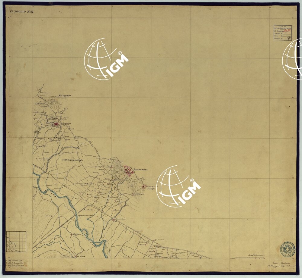 Sono 167 tavolette montate su tela o seta, copiate e messe in netto all’Officio Topografico di Napoli su le levate eseguite dal 1834 al 1860 per la formazione della Carta del Reame di Napoli alla scala di 1:80.000. L’esecuzione di questa carta venne decretata nel 1814: essa fu però iniziata, dati i movimenti politici di quell’epoca, soltanto nel 1833. Queste tavolette si riferiscono ai fogli 1, 5, 8, 9, 12, 13, 17-19, 28, 29, 33 della suddetta carta la quale doveva essere disegnata ed incisa su rame a bulino in fogli rettangolari con orografia a tratteggio e curve di livello tracciate alla equidistanza di 10 passi (m. 18,52) o di 52 passi (m. 92,60). Di essa peraltro furono pubblicati solamente cinque fogli, cioè: Napoli, Caserta, Gaeta, Leonessa, Cittaducale, tra il 1861 e 1870. L’I.G.M. conserva i rami dei primi tre di questi fogli. La carta all’80.000, pregevolissima per valore artistico e scientifico, venne giudicata superiore alle altre produzioni cartografiche contemporanee non solo italiane, ma europee (cfr. Mori A., La cartografia ufficiale in Italia e l’I.G.M. 1922, pag.107).