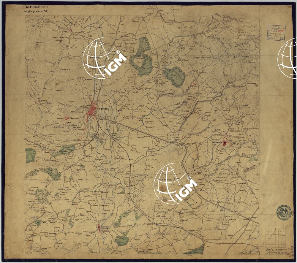 Sono 167 tavolette montate su tela o seta, copiate e messe in netto all’Officio Topografico di Napoli su le levate eseguite dal 1834 al 1860 per la formazione della Carta del Reame di Napoli alla scala di 1:80.000. L’esecuzione di questa carta venne decretata nel 1814: essa fu però iniziata, dati i movimenti politici di quell’epoca, soltanto nel 1833. Queste tavolette si riferiscono ai fogli 1, 5, 8, 9, 12, 13, 17-19, 28, 29, 33 della suddetta carta la quale doveva essere disegnata ed incisa su rame a bulino in fogli rettangolari con orografia a tratteggio e curve di livello tracciate alla equidistanza di 10 passi (m. 18,52) o di 52 passi (m. 92,60). Di essa peraltro furono pubblicati solamente cinque fogli, cioè: Napoli, Caserta, Gaeta, Leonessa, Cittaducale, tra il 1861 e 1870. L’I.G.M. conserva i rami dei primi tre di questi fogli. La carta all’80.000, pregevolissima per valore artistico e scientifico, venne giudicata superiore alle altre produzioni cartografiche contemporanee non solo italiane, ma europee (cfr. Mori A., La cartografia ufficiale in Italia e l’I.G.M. 1922, pag.107).