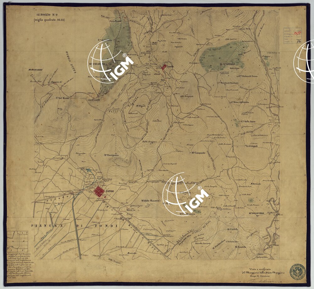Sono 167 tavolette montate su tela o seta, copiate e messe in netto all’Officio Topografico di Napoli su le levate eseguite dal 1834 al 1860 per la formazione della Carta del Reame di Napoli alla scala di 1:80.000. L’esecuzione di questa carta venne decretata nel 1814: essa fu però iniziata, dati i movimenti politici di quell’epoca, soltanto nel 1833. Queste tavolette si riferiscono ai fogli 1, 5, 8, 9, 12, 13, 17-19, 28, 29, 33 della suddetta carta la quale doveva essere disegnata ed incisa su rame a bulino in fogli rettangolari con orografia a tratteggio e curve di livello tracciate alla equidistanza di 10 passi (m. 18,52) o di 52 passi (m. 92,60). Di essa peraltro furono pubblicati solamente cinque fogli, cioè: Napoli, Caserta, Gaeta, Leonessa, Cittaducale, tra il 1861 e 1870. L’I.G.M. conserva i rami dei primi tre di questi fogli. La carta all’80.000, pregevolissima per valore artistico e scientifico, venne giudicata superiore alle altre produzioni cartografiche contemporanee non solo italiane, ma europee (cfr. Mori A., La cartografia ufficiale in Italia e l’I.G.M. 1922, pag.107).