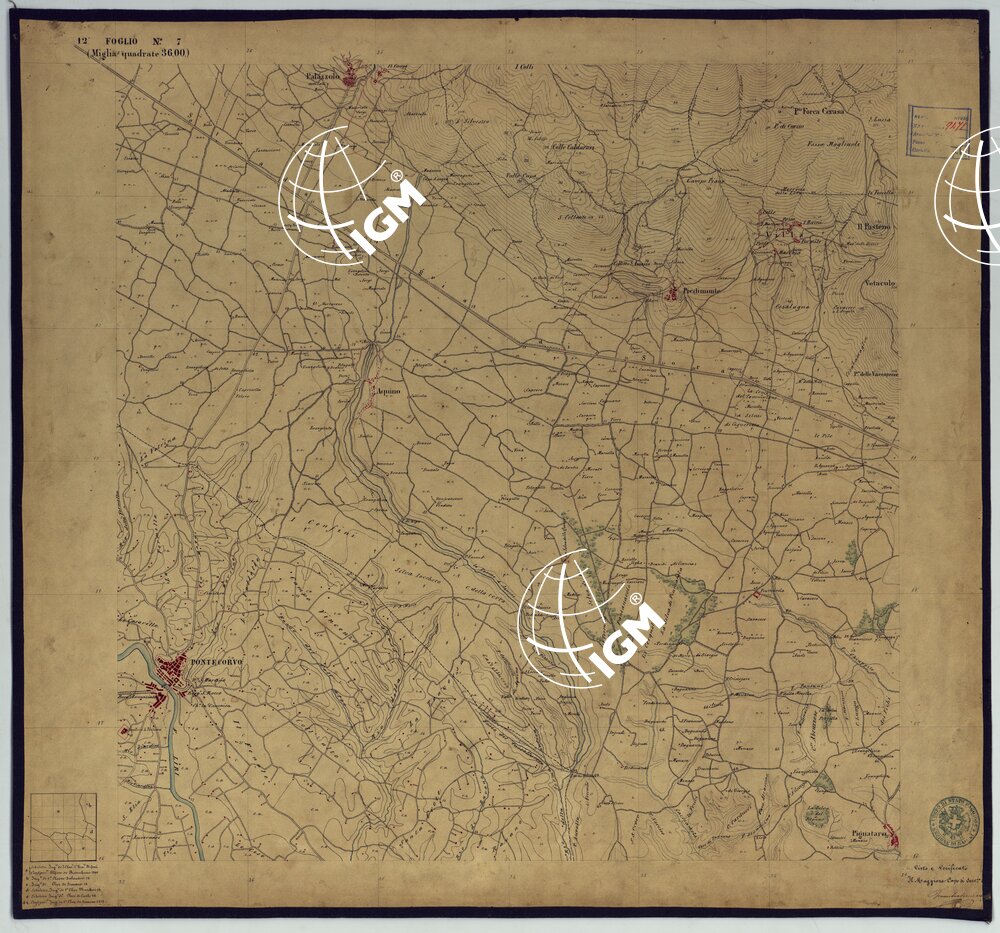 Sono 167 tavolette montate su tela o seta, copiate e messe in netto all’Officio Topografico di Napoli su le levate eseguite dal 1834 al 1860 per la formazione della Carta del Reame di Napoli alla scala di 1:80.000. L’esecuzione di questa carta venne decretata nel 1814: essa fu però iniziata, dati i movimenti politici di quell’epoca, soltanto nel 1833. Queste tavolette si riferiscono ai fogli 1, 5, 8, 9, 12, 13, 17-19, 28, 29, 33 della suddetta carta la quale doveva essere disegnata ed incisa su rame a bulino in fogli rettangolari con orografia a tratteggio e curve di livello tracciate alla equidistanza di 10 passi (m. 18,52) o di 52 passi (m. 92,60). Di essa peraltro furono pubblicati solamente cinque fogli, cioè: Napoli, Caserta, Gaeta, Leonessa, Cittaducale, tra il 1861 e 1870. L’I.G.M. conserva i rami dei primi tre di questi fogli. La carta all’80.000, pregevolissima per valore artistico e scientifico, venne giudicata superiore alle altre produzioni cartografiche contemporanee non solo italiane, ma europee (cfr. Mori A., La cartografia ufficiale in Italia e l’I.G.M. 1922, pag.107).