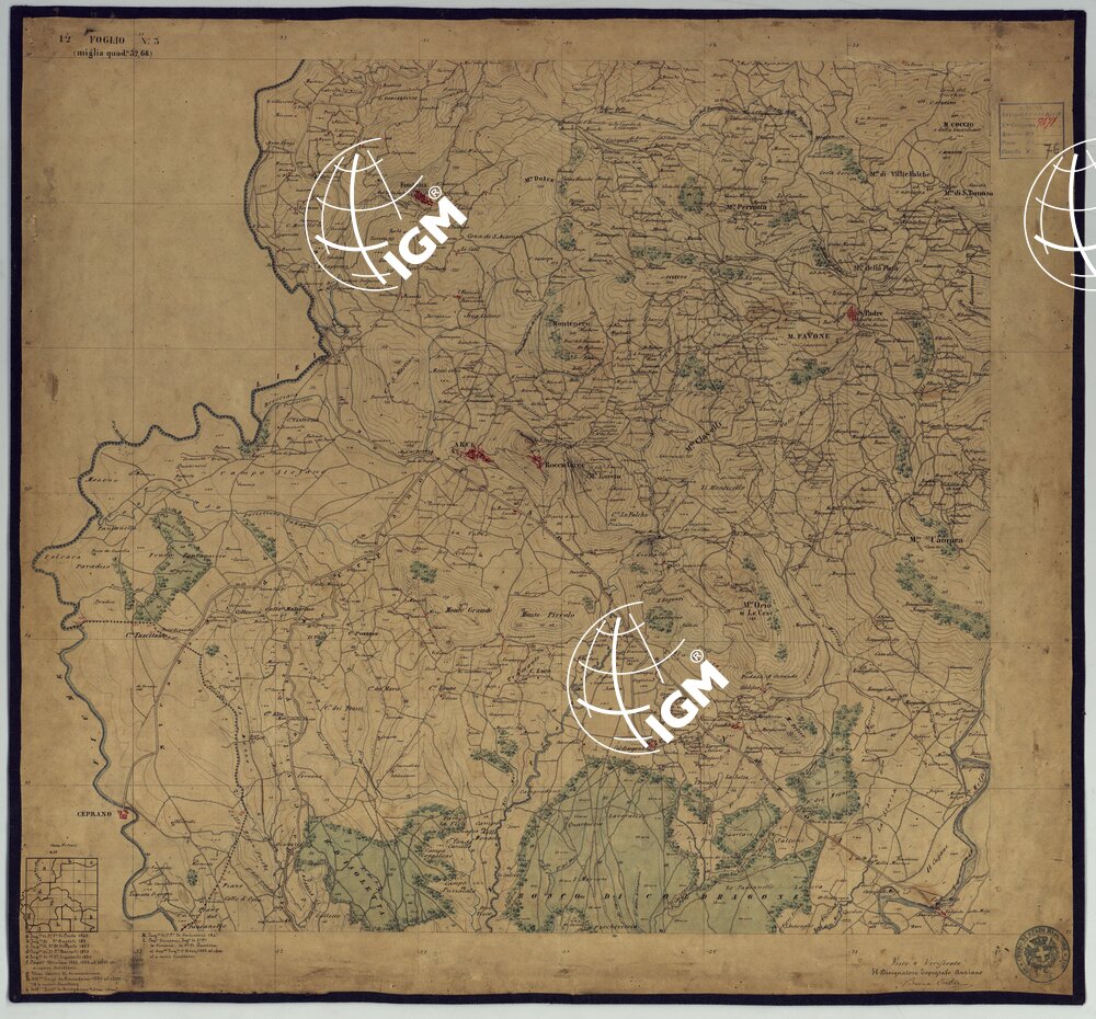 Sono 167 tavolette montate su tela o seta, copiate e messe in netto all’Officio Topografico di Napoli su le levate eseguite dal 1834 al 1860 per la formazione della Carta del Reame di Napoli alla scala di 1:80.000. L’esecuzione di questa carta venne decretata nel 1814: essa fu però iniziata, dati i movimenti politici di quell’epoca, soltanto nel 1833. Queste tavolette si riferiscono ai fogli 1, 5, 8, 9, 12, 13, 17-19, 28, 29, 33 della suddetta carta la quale doveva essere disegnata ed incisa su rame a bulino in fogli rettangolari con orografia a tratteggio e curve di livello tracciate alla equidistanza di 10 passi (m. 18,52) o di 52 passi (m. 92,60). Di essa peraltro furono pubblicati solamente cinque fogli, cioè: Napoli, Caserta, Gaeta, Leonessa, Cittaducale, tra il 1861 e 1870. L’I.G.M. conserva i rami dei primi tre di questi fogli. La carta all’80.000, pregevolissima per valore artistico e scientifico, venne giudicata superiore alle altre produzioni cartografiche contemporanee non solo italiane, ma europee (cfr. Mori A., La cartografia ufficiale in Italia e l’I.G.M. 1922, pag.107).