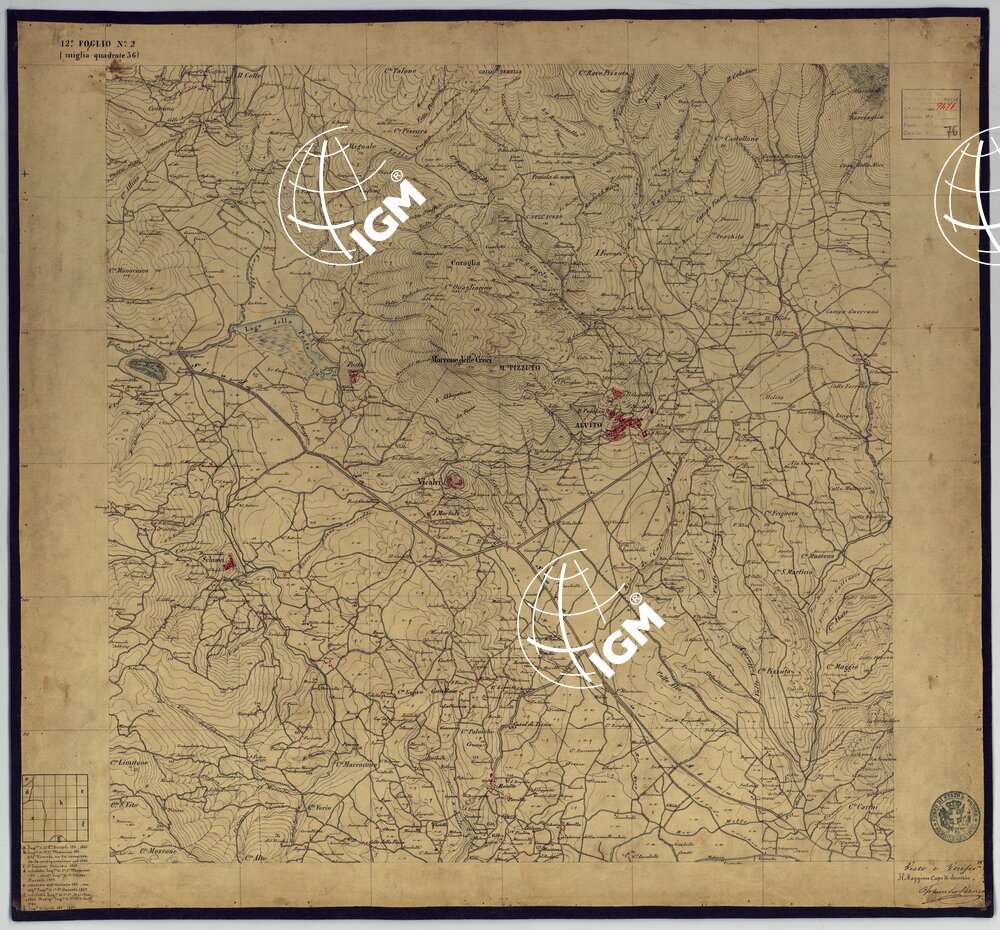 Sono 167 tavolette montate su tela o seta, copiate e messe in netto all’Officio Topografico di Napoli su le levate eseguite dal 1834 al 1860 per la formazione della Carta del Reame di Napoli alla scala di 1:80.000. L’esecuzione di questa carta venne decretata nel 1814: essa fu però iniziata, dati i movimenti politici di quell’epoca, soltanto nel 1833. Queste tavolette si riferiscono ai fogli 1, 5, 8, 9, 12, 13, 17-19, 28, 29, 33 della suddetta carta la quale doveva essere disegnata ed incisa su rame a bulino in fogli rettangolari con orografia a tratteggio e curve di livello tracciate alla equidistanza di 10 passi (m. 18,52) o di 52 passi (m. 92,60). Di essa peraltro furono pubblicati solamente cinque fogli, cioè: Napoli, Caserta, Gaeta, Leonessa, Cittaducale, tra il 1861 e 1870. L’I.G.M. conserva i rami dei primi tre di questi fogli. La carta all’80.000, pregevolissima per valore artistico e scientifico, venne giudicata superiore alle altre produzioni cartografiche contemporanee non solo italiane, ma europee (cfr. Mori A., La cartografia ufficiale in Italia e l’I.G.M. 1922, pag.107).