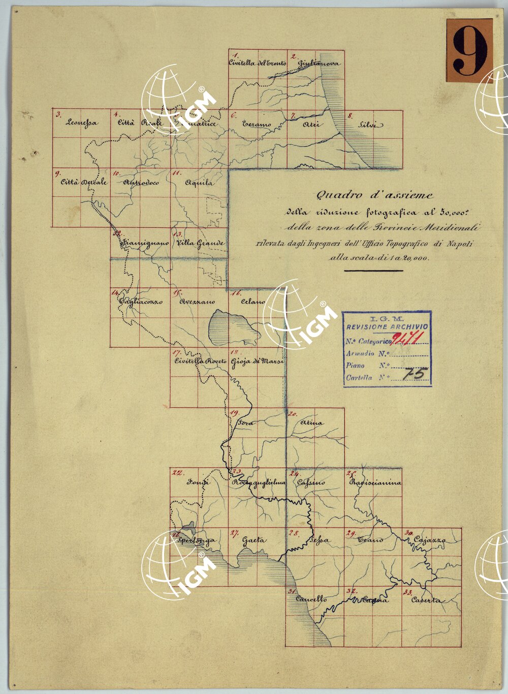 TAVOLETTE AL 20.000 PER LA CARTA DEL REGNO DI NAPOLI – QUADRO D’INSIEME DELLA RIDUZIONE FOTOGRAFICA AL 50,000 DELLA ZONA DELLE PROVINCIE MERIDIONALI RILEVATA DAGLI INGEGNERI DELL’UFFICIO TOPOGRAFICO DI NAPOLI ALLA SCALA DI 1 A 20,000.