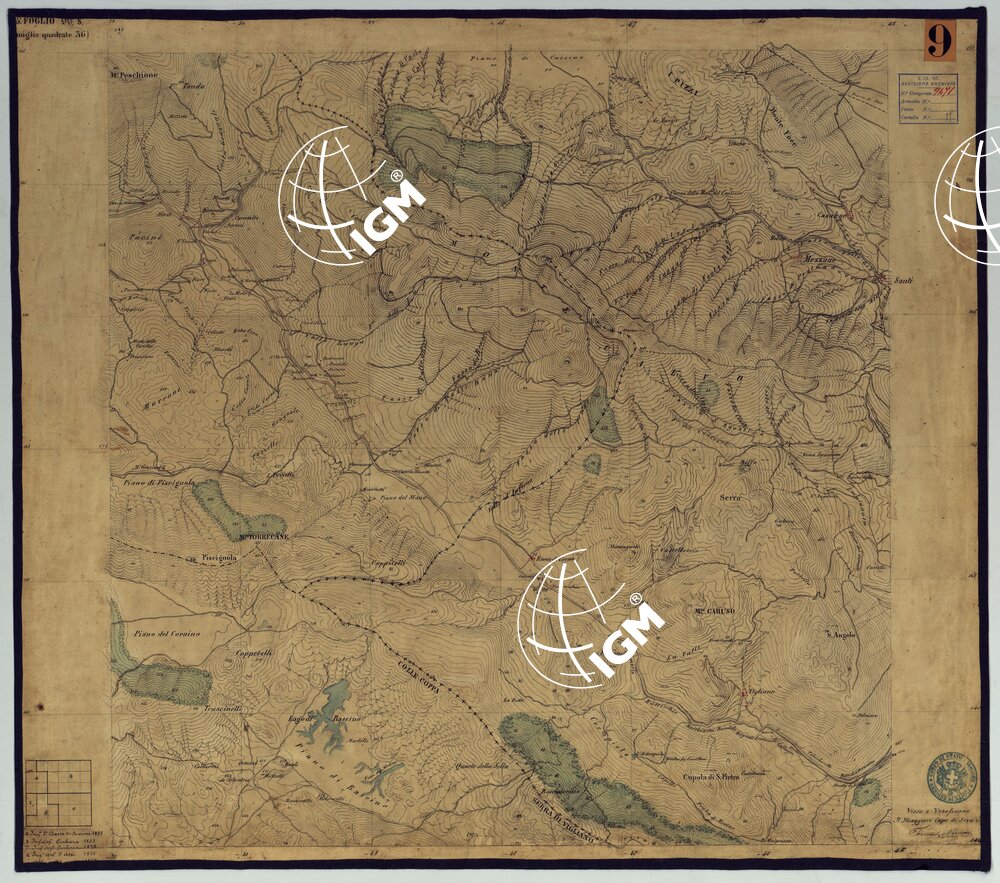 Sono 167 tavolette montate su tela o seta, copiate e messe in netto all’Officio Topografico di Napoli su le levate eseguite dal 1834 al 1860 per la formazione della Carta del Reame di Napoli alla scala di 1:80.000. L’esecuzione di questa carta venne decretata nel 1814: essa fu però iniziata, dati i movimenti politici di quell’epoca, soltanto nel 1833. Queste tavolette si riferiscono ai fogli 1, 5, 8, 9, 12, 13, 17-19, 28, 29, 33 della suddetta carta la quale doveva essere disegnata ed incisa su rame a bulino in fogli rettangolari con orografia a tratteggio e curve di livello tracciate alla equidistanza di 10 passi (m. 18,52) o di 52 passi (m. 92,60). Di essa peraltro furono pubblicati solamente cinque fogli, cioè: Napoli, Caserta, Gaeta, Leonessa, Cittaducale, tra il 1861 e 1870. L’I.G.M. conserva i rami dei primi tre di questi fogli. La carta all’80.000, pregevolissima per valore artistico e scientifico, venne giudicata superiore alle altre produzioni cartografiche contemporanee non solo italiane, ma europee (cfr. Mori A., La cartografia ufficiale in Italia e l’I.G.M. 1922, pag.107).