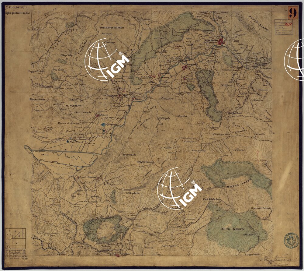 Sono 167 tavolette montate su tela o seta, copiate e messe in netto all’Officio Topografico di Napoli su le levate eseguite dal 1834 al 1860 per la formazione della Carta del Reame di Napoli alla scala di 1:80.000. L’esecuzione di questa carta venne decretata nel 1814: essa fu però iniziata, dati i movimenti politici di quell’epoca, soltanto nel 1833. Queste tavolette si riferiscono ai fogli 1, 5, 8, 9, 12, 13, 17-19, 28, 29, 33 della suddetta carta la quale doveva essere disegnata ed incisa su rame a bulino in fogli rettangolari con orografia a tratteggio e curve di livello tracciate alla equidistanza di 10 passi (m. 18,52) o di 52 passi (m. 92,60). Di essa peraltro furono pubblicati solamente cinque fogli, cioè: Napoli, Caserta, Gaeta, Leonessa, Cittaducale, tra il 1861 e 1870. L’I.G.M. conserva i rami dei primi tre di questi fogli. La carta all’80.000, pregevolissima per valore artistico e scientifico, venne giudicata superiore alle altre produzioni cartografiche contemporanee non solo italiane, ma europee (cfr. Mori A., La cartografia ufficiale in Italia e l’I.G.M. 1922, pag.107).