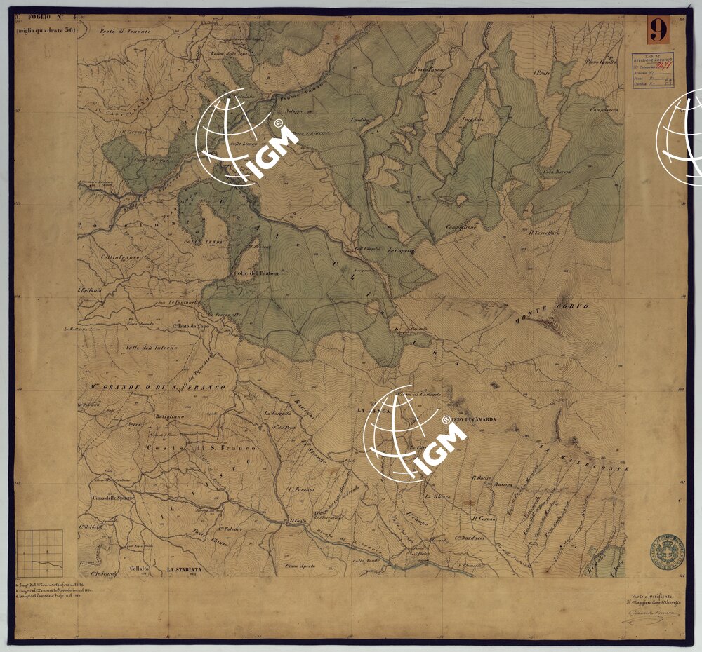 Sono 167 tavolette montate su tela o seta, copiate e messe in netto all’Officio Topografico di Napoli su le levate eseguite dal 1834 al 1860 per la formazione della Carta del Reame di Napoli alla scala di 1:80.000. L’esecuzione di questa carta venne decretata nel 1814: essa fu però iniziata, dati i movimenti politici di quell’epoca, soltanto nel 1833. Queste tavolette si riferiscono ai fogli 1, 5, 8, 9, 12, 13, 17-19, 28, 29, 33 della suddetta carta la quale doveva essere disegnata ed incisa su rame a bulino in fogli rettangolari con orografia a tratteggio e curve di livello tracciate alla equidistanza di 10 passi (m. 18,52) o di 52 passi (m. 92,60). Di essa peraltro furono pubblicati solamente cinque fogli, cioè: Napoli, Caserta, Gaeta, Leonessa, Cittaducale, tra il 1861 e 1870. L’I.G.M. conserva i rami dei primi tre di questi fogli. La carta all’80.000, pregevolissima per valore artistico e scientifico, venne giudicata superiore alle altre produzioni cartografiche contemporanee non solo italiane, ma europee (cfr. Mori A., La cartografia ufficiale in Italia e l’I.G.M. 1922, pag.107).