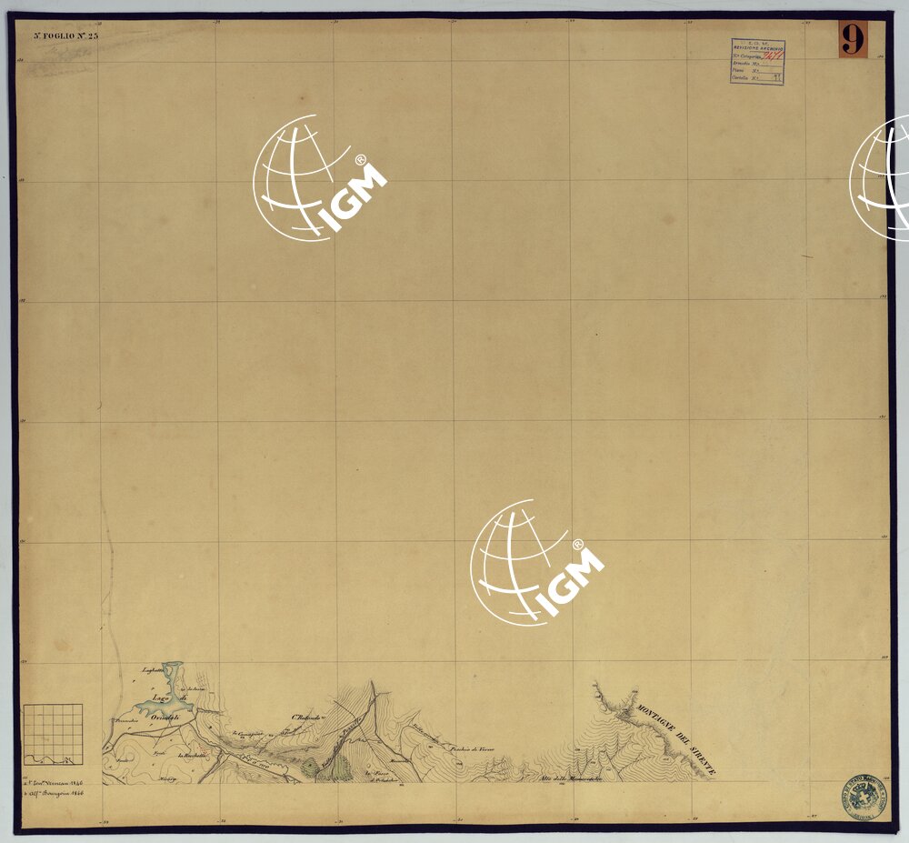 Sono 167 tavolette montate su tela o seta, copiate e messe in netto all’Officio Topografico di Napoli su le levate eseguite dal 1834 al 1860 per la formazione della Carta del Reame di Napoli alla scala di 1:80.000. L’esecuzione di questa carta venne decretata nel 1814: essa fu però iniziata, dati i movimenti politici di quell’epoca, soltanto nel 1833. Queste tavolette si riferiscono ai fogli 1, 5, 8, 9, 12, 13, 17-19, 28, 29, 33 della suddetta carta la quale doveva essere disegnata ed incisa su rame a bulino in fogli rettangolari con orografia a tratteggio e curve di livello tracciate alla equidistanza di 10 passi (m. 18,52) o di 52 passi (m. 92,60). Di essa peraltro furono pubblicati solamente cinque fogli, cioè: Napoli, Caserta, Gaeta, Leonessa, Cittaducale, tra il 1861 e 1870. L’I.G.M. conserva i rami dei primi tre di questi fogli. La carta all’80.000, pregevolissima per valore artistico e scientifico, venne giudicata superiore alle altre produzioni cartografiche contemporanee non solo italiane, ma europee (cfr. Mori A., La cartografia ufficiale in Italia e l’I.G.M. 1922, pag.107).