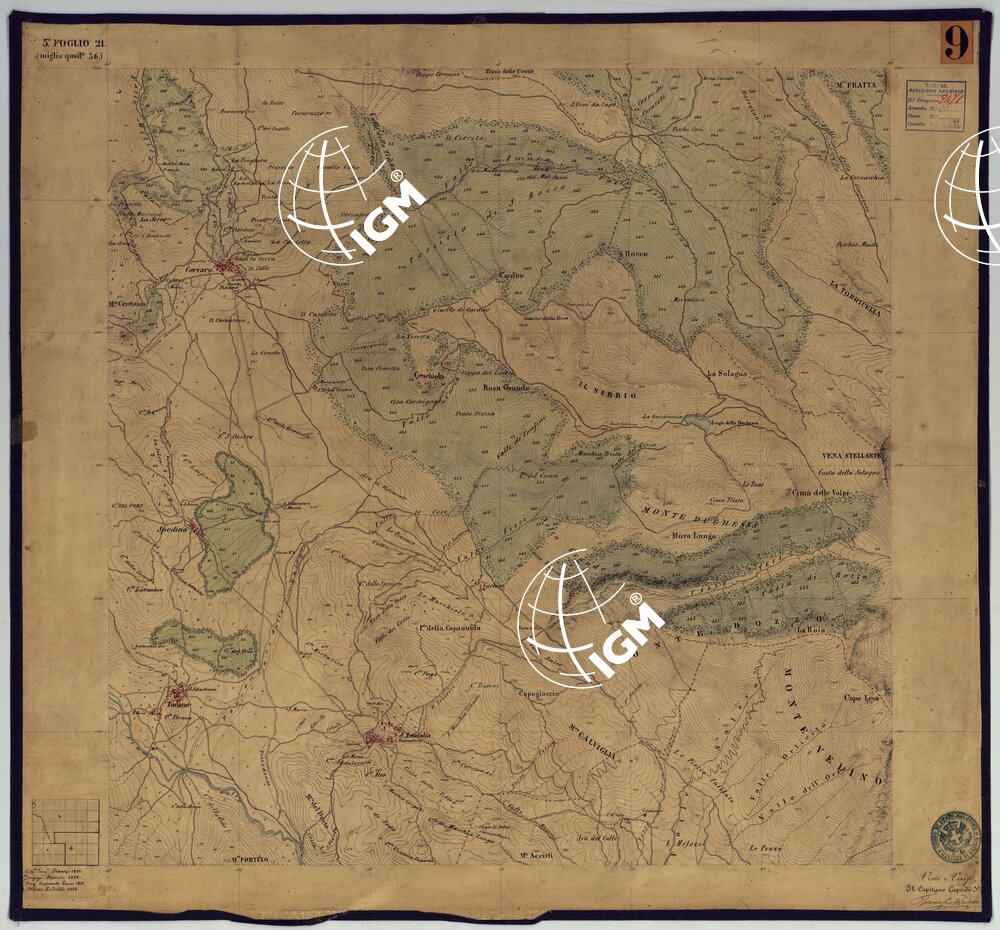 Sono 167 tavolette montate su tela o seta, copiate e messe in netto all’Officio Topografico di Napoli su le levate eseguite dal 1834 al 1860 per la formazione della Carta del Reame di Napoli alla scala di 1:80.000. L’esecuzione di questa carta venne decretata nel 1814: essa fu però iniziata, dati i movimenti politici di quell’epoca, soltanto nel 1833. Queste tavolette si riferiscono ai fogli 1, 5, 8, 9, 12, 13, 17-19, 28, 29, 33 della suddetta carta la quale doveva essere disegnata ed incisa su rame a bulino in fogli rettangolari con orografia a tratteggio e curve di livello tracciate alla equidistanza di 10 passi (m. 18,52) o di 52 passi (m. 92,60). Di essa peraltro furono pubblicati solamente cinque fogli, cioè: Napoli, Caserta, Gaeta, Leonessa, Cittaducale, tra il 1861 e 1870. L’I.G.M. conserva i rami dei primi tre di questi fogli. La carta all’80.000, pregevolissima per valore artistico e scientifico, venne giudicata superiore alle altre produzioni cartografiche contemporanee non solo italiane, ma europee (cfr. Mori A., La cartografia ufficiale in Italia e l’I.G.M. 1922, pag.107).