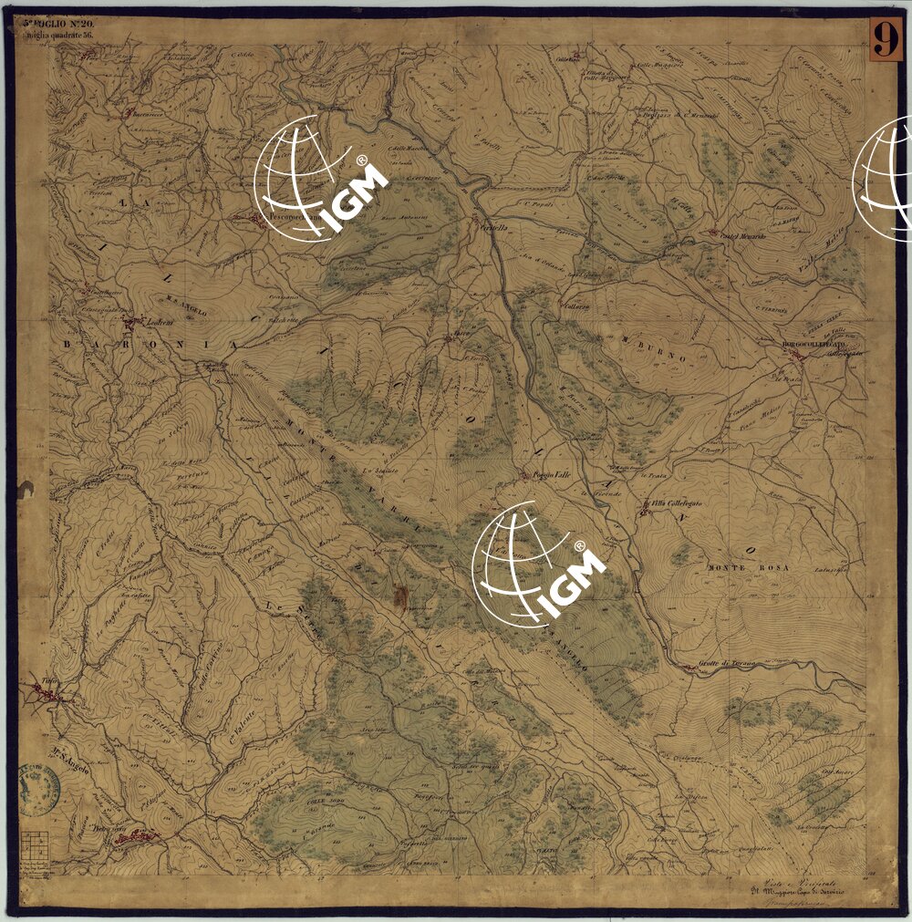 Sono 167 tavolette montate su tela o seta, copiate e messe in netto all’Officio Topografico di Napoli su le levate eseguite dal 1834 al 1860 per la formazione della Carta del Reame di Napoli alla scala di 1:80.000. L’esecuzione di questa carta venne decretata nel 1814: essa fu però iniziata, dati i movimenti politici di quell’epoca, soltanto nel 1833. Queste tavolette si riferiscono ai fogli 1, 5, 8, 9, 12, 13, 17-19, 28, 29, 33 della suddetta carta la quale doveva essere disegnata ed incisa su rame a bulino in fogli rettangolari con orografia a tratteggio e curve di livello tracciate alla equidistanza di 10 passi (m. 18,52) o di 52 passi (m. 92,60). Di essa peraltro furono pubblicati solamente cinque fogli, cioè: Napoli, Caserta, Gaeta, Leonessa, Cittaducale, tra il 1861 e 1870. L’I.G.M. conserva i rami dei primi tre di questi fogli. La carta all’80.000, pregevolissima per valore artistico e scientifico, venne giudicata superiore alle altre produzioni cartografiche contemporanee non solo italiane, ma europee (cfr. Mori A., La cartografia ufficiale in Italia e l’I.G.M. 1922, pag.107).