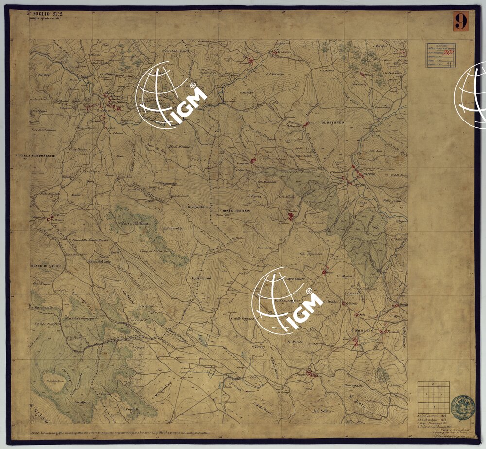 Sono 167 tavolette montate su tela o seta, copiate e messe in netto all’Officio Topografico di Napoli su le levate eseguite dal 1834 al 1860 per la formazione della Carta del Reame di Napoli alla scala di 1:80.000. L’esecuzione di questa carta venne decretata nel 1814: essa fu però iniziata, dati i movimenti politici di quell’epoca, soltanto nel 1833. Queste tavolette si riferiscono ai fogli 1, 5, 8, 9, 12, 13, 17-19, 28, 29, 33 della suddetta carta la quale doveva essere disegnata ed incisa su rame a bulino in fogli rettangolari con orografia a tratteggio e curve di livello tracciate alla equidistanza di 10 passi (m. 18,52) o di 52 passi (m. 92,60). Di essa peraltro furono pubblicati solamente cinque fogli, cioè: Napoli, Caserta, Gaeta, Leonessa, Cittaducale, tra il 1861 e 1870. L’I.G.M. conserva i rami dei primi tre di questi fogli. La carta all’80.000, pregevolissima per valore artistico e scientifico, venne giudicata superiore alle altre produzioni cartografiche contemporanee non solo italiane, ma europee (cfr. Mori A., La cartografia ufficiale in Italia e l’I.G.M. 1922, pag.107).