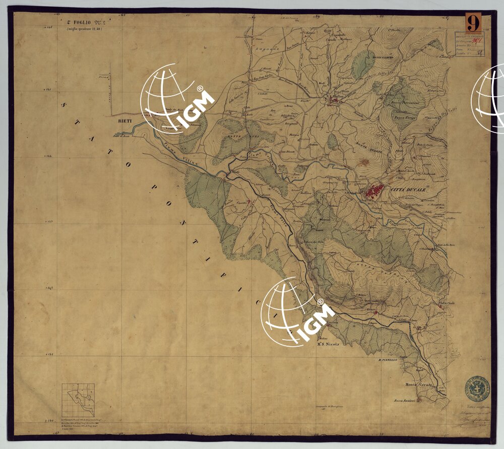 Sono 167 tavolette montate su tela o seta, copiate e messe in netto all’Officio Topografico di Napoli su le levate eseguite dal 1834 al 1860 per la formazione della Carta del Reame di Napoli alla scala di 1:80.000. L’esecuzione di questa carta venne decretata nel 1814: essa fu però iniziata, dati i movimenti politici di quell’epoca, soltanto nel 1833. Queste tavolette si riferiscono ai fogli 1, 5, 8, 9, 12, 13, 17-19, 28, 29, 33 della suddetta carta la quale doveva essere disegnata ed incisa su rame a bulino in fogli rettangolari con orografia a tratteggio e curve di livello tracciate alla equidistanza di 10 passi (m. 18,52) o di 52 passi (m. 92,60). Di essa peraltro furono pubblicati solamente cinque fogli, cioè: Napoli, Caserta, Gaeta, Leonessa, Cittaducale, tra il 1861 e 1870. L’I.G.M. conserva i rami dei primi tre di questi fogli. La carta all’80.000, pregevolissima per valore artistico e scientifico, venne giudicata superiore alle altre produzioni cartografiche contemporanee non solo italiane, ma europee (cfr. Mori A., La cartografia ufficiale in Italia e l’I.G.M. 1922, pag.107).
