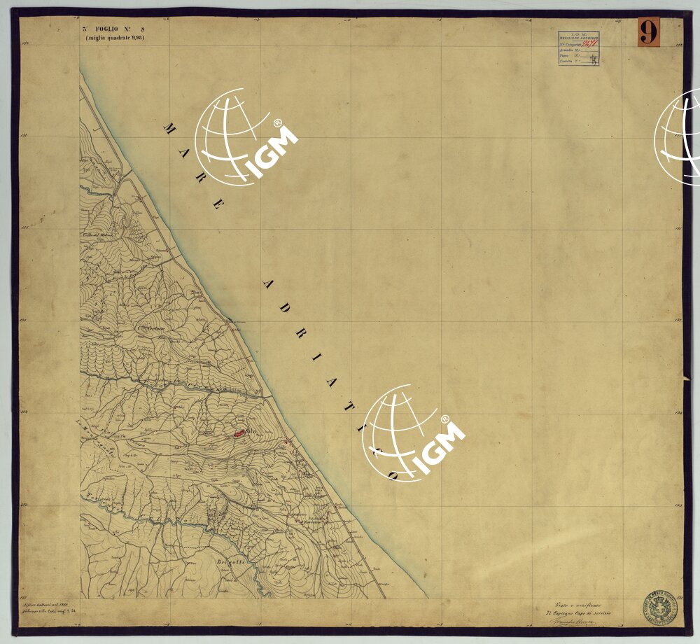 Sono 167 tavolette montate su tela o seta, copiate e messe in netto all’Officio Topografico di Napoli su le levate eseguite dal 1834 al 1860 per la formazione della Carta del Reame di Napoli alla scala di 1:80.000. L’esecuzione di questa carta venne decretata nel 1814: essa fu però iniziata, dati i movimenti politici di quell’epoca, soltanto nel 1833. Queste tavolette si riferiscono ai fogli 1, 5, 8, 9, 12, 13, 17-19, 28, 29, 33 della suddetta carta la quale doveva essere disegnata ed incisa su rame a bulino in fogli rettangolari con orografia a tratteggio e curve di livello tracciate alla equidistanza di 10 passi (m. 18,52) o di 52 passi (m. 92,60). Di essa peraltro furono pubblicati solamente cinque fogli, cioè: Napoli, Caserta, Gaeta, Leonessa, Cittaducale, tra il 1861 e 1870. L’I.G.M. conserva i rami dei primi tre di questi fogli. La carta all’80.000, pregevolissima per valore artistico e scientifico, venne giudicata superiore alle altre produzioni cartografiche contemporanee non solo italiane, ma europee (cfr. Mori A., La cartografia ufficiale in Italia e l’I.G.M. 1922, pag.107).