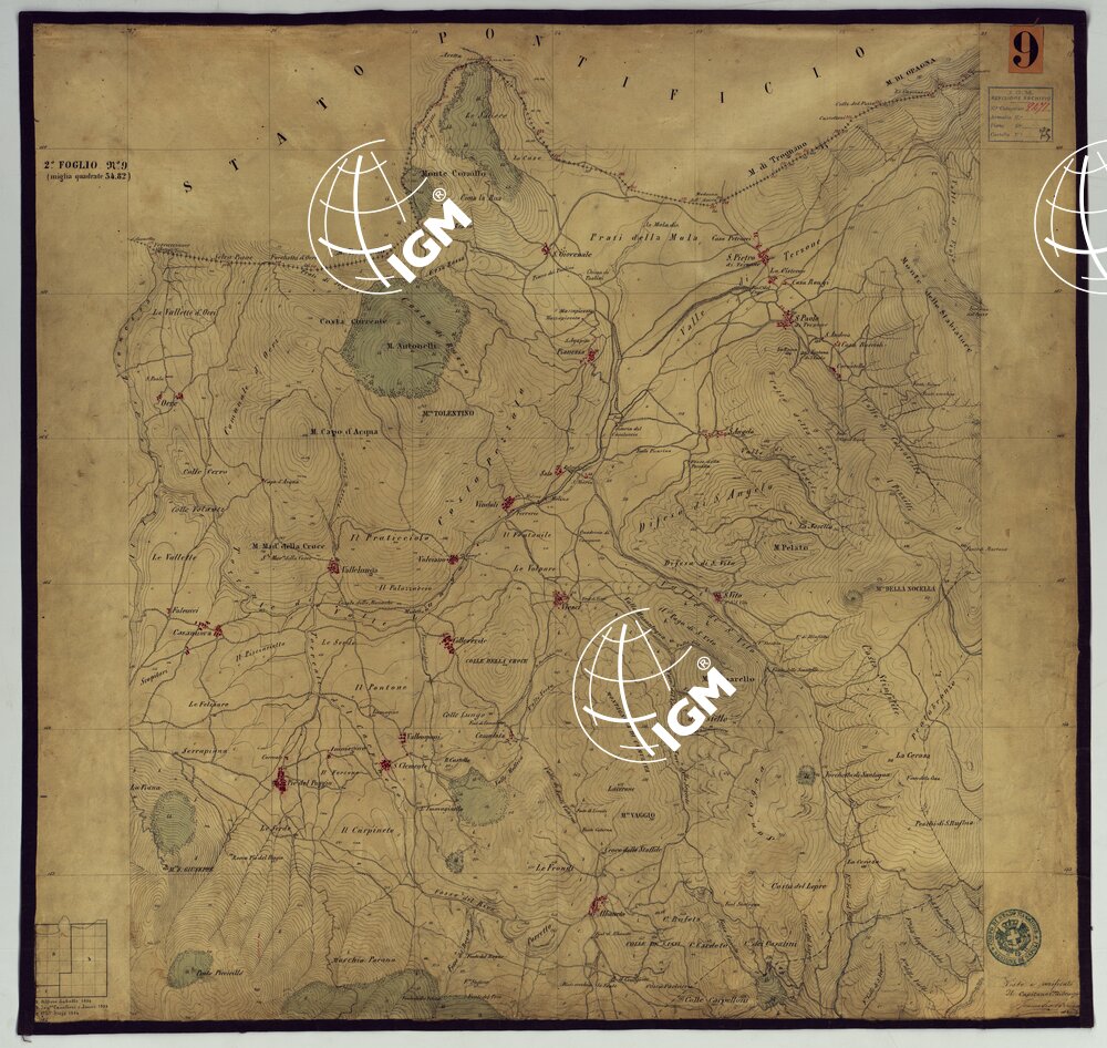 Sono 167 tavolette montate su tela o seta, copiate e messe in netto all’Officio Topografico di Napoli su le levate eseguite dal 1834 al 1860 per la formazione della Carta del Reame di Napoli alla scala di 1:80.000. L’esecuzione di questa carta venne decretata nel 1814: essa fu però iniziata, dati i movimenti politici di quell’epoca, soltanto nel 1833. Queste tavolette si riferiscono ai fogli 1, 5, 8, 9, 12, 13, 17-19, 28, 29, 33 della suddetta carta la quale doveva essere disegnata ed incisa su rame a bulino in fogli rettangolari con orografia a tratteggio e curve di livello tracciate alla equidistanza di 10 passi (m. 18,52) o di 52 passi (m. 92,60). Di essa peraltro furono pubblicati solamente cinque fogli, cioè: Napoli, Caserta, Gaeta, Leonessa, Cittaducale, tra il 1861 e 1870. L’I.G.M. conserva i rami dei primi tre di questi fogli. La carta all’80.000, pregevolissima per valore artistico e scientifico, venne giudicata superiore alle altre produzioni cartografiche contemporanee non solo italiane, ma europee (cfr. Mori A., La cartografia ufficiale in Italia e l’I.G.M. 1922, pag.107).