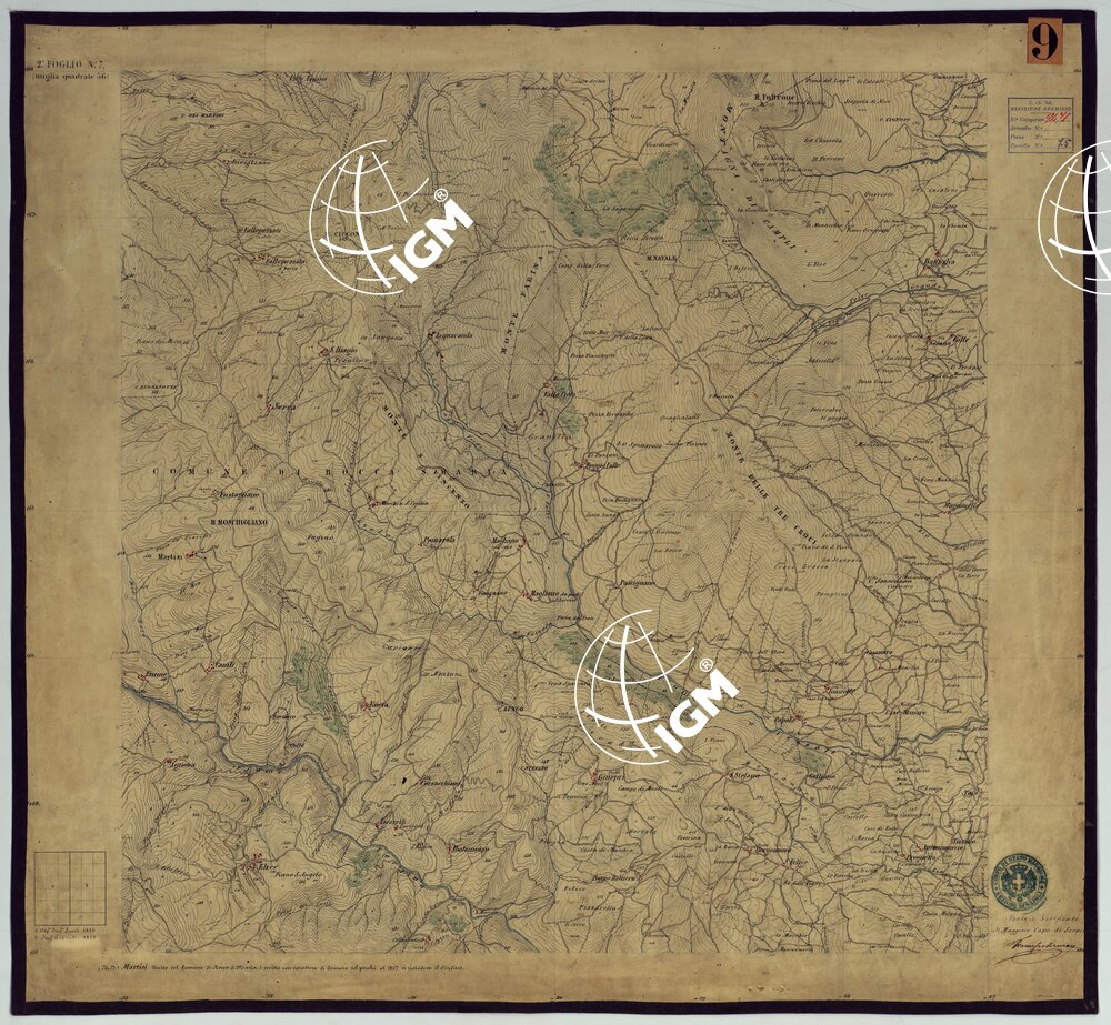 Sono 167 tavolette montate su tela o seta, copiate e messe in netto all’Officio Topografico di Napoli su le levate eseguite dal 1834 al 1860 per la formazione della Carta del Reame di Napoli alla scala di 1:80.000. L’esecuzione di questa carta venne decretata nel 1814: essa fu però iniziata, dati i movimenti politici di quell’epoca, soltanto nel 1833. Queste tavolette si riferiscono ai fogli 1, 5, 8, 9, 12, 13, 17-19, 28, 29, 33 della suddetta carta la quale doveva essere disegnata ed incisa su rame a bulino in fogli rettangolari con orografia a tratteggio e curve di livello tracciate alla equidistanza di 10 passi (m. 18,52) o di 52 passi (m. 92,60). Di essa peraltro furono pubblicati solamente cinque fogli, cioè: Napoli, Caserta, Gaeta, Leonessa, Cittaducale, tra il 1861 e 1870. L’I.G.M. conserva i rami dei primi tre di questi fogli. La carta all’80.000, pregevolissima per valore artistico e scientifico, venne giudicata superiore alle altre produzioni cartografiche contemporanee non solo italiane, ma europee (cfr. Mori A., La cartografia ufficiale in Italia e l’I.G.M. 1922, pag.107).