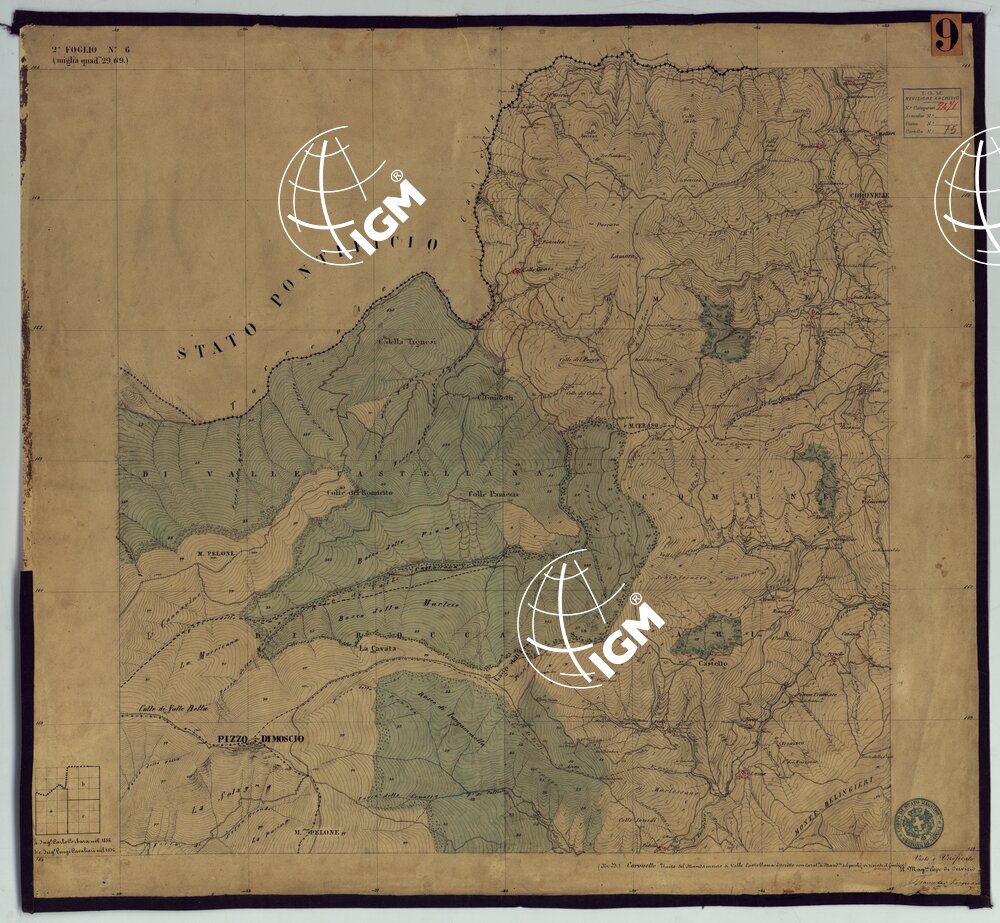 Sono 167 tavolette montate su tela o seta, copiate e messe in netto all’Officio Topografico di Napoli su le levate eseguite dal 1834 al 1860 per la formazione della Carta del Reame di Napoli alla scala di 1:80.000. L’esecuzione di questa carta venne decretata nel 1814: essa fu però iniziata, dati i movimenti politici di quell’epoca, soltanto nel 1833. Queste tavolette si riferiscono ai fogli 1, 5, 8, 9, 12, 13, 17-19, 28, 29, 33 della suddetta carta la quale doveva essere disegnata ed incisa su rame a bulino in fogli rettangolari con orografia a tratteggio e curve di livello tracciate alla equidistanza di 10 passi (m. 18,52) o di 52 passi (m. 92,60). Di essa peraltro furono pubblicati solamente cinque fogli, cioè: Napoli, Caserta, Gaeta, Leonessa, Cittaducale, tra il 1861 e 1870. L’I.G.M. conserva i rami dei primi tre di questi fogli. La carta all’80.000, pregevolissima per valore artistico e scientifico, venne giudicata superiore alle altre produzioni cartografiche contemporanee non solo italiane, ma europee (cfr. Mori A., La cartografia ufficiale in Italia e l’I.G.M. 1922, pag.107).
