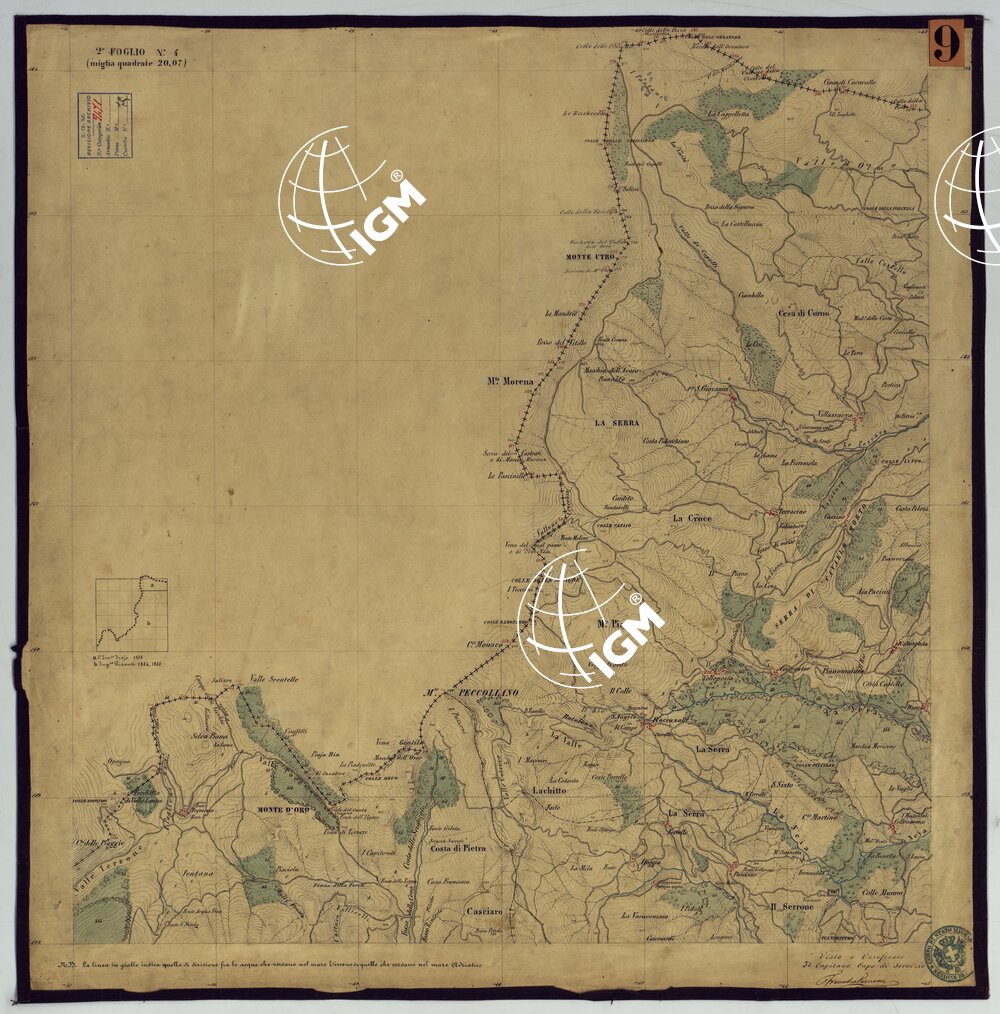 Sono 167 tavolette montate su tela o seta, copiate e messe in netto all’Officio Topografico di Napoli su le levate eseguite dal 1834 al 1860 per la formazione della Carta del Reame di Napoli alla scala di 1:80.000. L’esecuzione di questa carta venne decretata nel 1814: essa fu però iniziata, dati i movimenti politici di quell’epoca, soltanto nel 1833. Queste tavolette si riferiscono ai fogli 1, 5, 8, 9, 12, 13, 17-19, 28, 29, 33 della suddetta carta la quale doveva essere disegnata ed incisa su rame a bulino in fogli rettangolari con orografia a tratteggio e curve di livello tracciate alla equidistanza di 10 passi (m. 18,52) o di 52 passi (m. 92,60). Di essa peraltro furono pubblicati solamente cinque fogli, cioè: Napoli, Caserta, Gaeta, Leonessa, Cittaducale, tra il 1861 e 1870. L’I.G.M. conserva i rami dei primi tre di questi fogli. La carta all’80.000, pregevolissima per valore artistico e scientifico, venne giudicata superiore alle altre produzioni cartografiche contemporanee non solo italiane, ma europee (cfr. Mori A., La cartografia ufficiale in Italia e l’I.G.M. 1922, pag.107).
