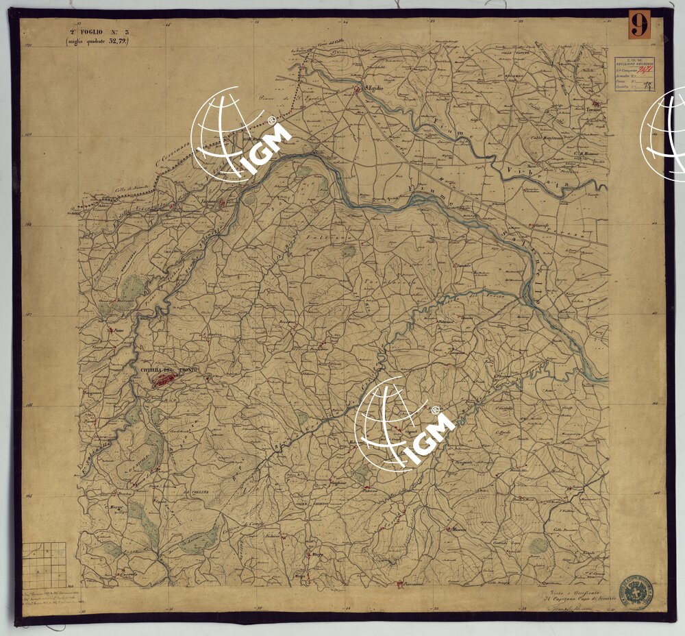 Sono 167 tavolette montate su tela o seta, copiate e messe in netto all’Officio Topografico di Napoli su le levate eseguite dal 1834 al 1860 per la formazione della Carta del Reame di Napoli alla scala di 1:80.000. L’esecuzione di questa carta venne decretata nel 1814: essa fu però iniziata, dati i movimenti politici di quell’epoca, soltanto nel 1833. Queste tavolette si riferiscono ai fogli 1, 5, 8, 9, 12, 13, 17-19, 28, 29, 33 della suddetta carta la quale doveva essere disegnata ed incisa su rame a bulino in fogli rettangolari con orografia a tratteggio e curve di livello tracciate alla equidistanza di 10 passi (m. 18,52) o di 52 passi (m. 92,60). Di essa peraltro furono pubblicati solamente cinque fogli, cioè: Napoli, Caserta, Gaeta, Leonessa, Cittaducale, tra il 1861 e 1870. L’I.G.M. conserva i rami dei primi tre di questi fogli. La carta all’80.000, pregevolissima per valore artistico e scientifico, venne giudicata superiore alle altre produzioni cartografiche contemporanee non solo italiane, ma europee (cfr. Mori A., La cartografia ufficiale in Italia e l’I.G.M. 1922, pag.107).