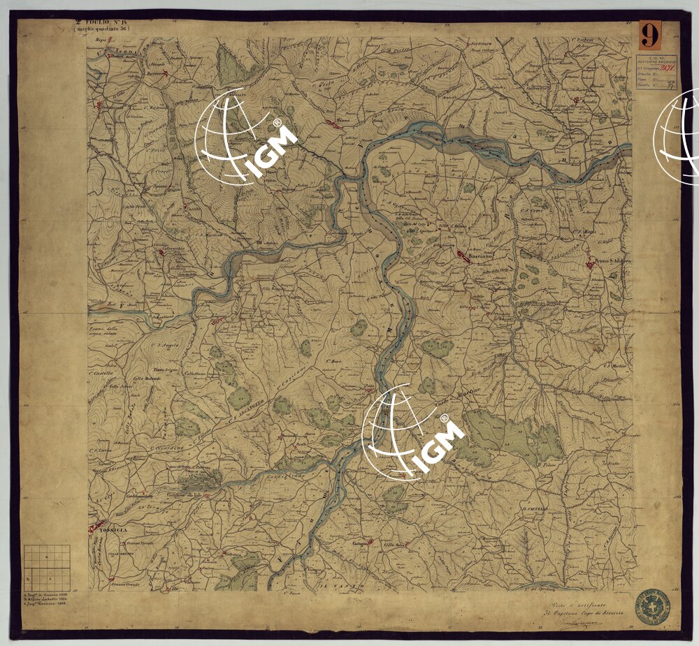 Sono 167 tavolette montate su tela o seta, copiate e messe in netto all’Officio Topografico di Napoli su le levate eseguite dal 1834 al 1860 per la formazione della Carta del Reame di Napoli alla scala di 1:80.000. L’esecuzione di questa carta venne decretata nel 1814: essa fu però iniziata, dati i movimenti politici di quell’epoca, soltanto nel 1833. Queste tavolette si riferiscono ai fogli 1, 5, 8, 9, 12, 13, 17-19, 28, 29, 33 della suddetta carta la quale doveva essere disegnata ed incisa su rame a bulino in fogli rettangolari con orografia a tratteggio e curve di livello tracciate alla equidistanza di 10 passi (m. 18,52) o di 52 passi (m. 92,60). Di essa peraltro furono pubblicati solamente cinque fogli, cioè: Napoli, Caserta, Gaeta, Leonessa, Cittaducale, tra il 1861 e 1870. L’I.G.M. conserva i rami dei primi tre di questi fogli. La carta all’80.000, pregevolissima per valore artistico e scientifico, venne giudicata superiore alle altre produzioni cartografiche contemporanee non solo italiane, ma europee (cfr. Mori A., La cartografia ufficiale in Italia e l’I.G.M. 1922, pag.107).
