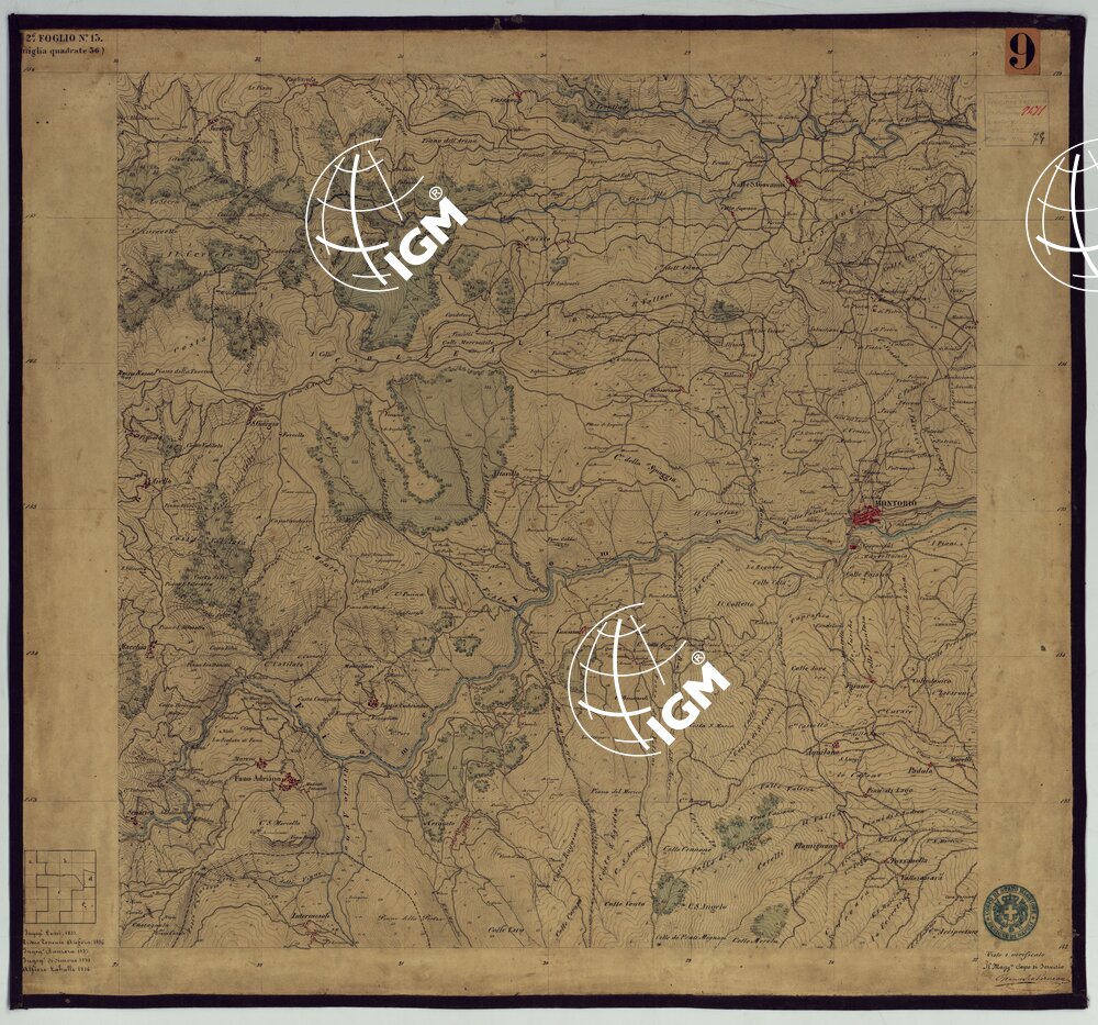 Sono 167 tavolette montate su tela o seta, copiate e messe in netto all’Officio Topografico di Napoli su le levate eseguite dal 1834 al 1860 per la formazione della Carta del Reame di Napoli alla scala di 1:80.000. L’esecuzione di questa carta venne decretata nel 1814: essa fu però iniziata, dati i movimenti politici di quell’epoca, soltanto nel 1833. Queste tavolette si riferiscono ai fogli 1, 5, 8, 9, 12, 13, 17-19, 28, 29, 33 della suddetta carta la quale doveva essere disegnata ed incisa su rame a bulino in fogli rettangolari con orografia a tratteggio e curve di livello tracciate alla equidistanza di 10 passi (m. 18,52) o di 52 passi (m. 92,60). Di essa peraltro furono pubblicati solamente cinque fogli, cioè: Napoli, Caserta, Gaeta, Leonessa, Cittaducale, tra il 1861 e 1870. L’I.G.M. conserva i rami dei primi tre di questi fogli. La carta all’80.000, pregevolissima per valore artistico e scientifico, venne giudicata superiore alle altre produzioni cartografiche contemporanee non solo italiane, ma europee (cfr. Mori A., La cartografia ufficiale in Italia e l’I.G.M. 1922, pag.107).