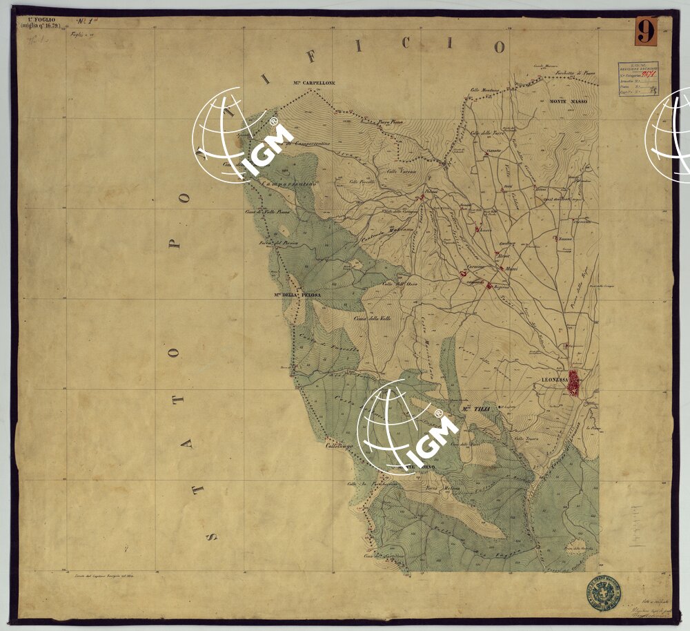 Sono 167 tavolette montate su tela o seta, copiate e messe in netto all’Officio Topografico di Napoli su le levate eseguite dal 1834 al 1860 per la formazione della Carta del Reame di Napoli alla scala di 1:80.000. L’esecuzione di questa carta venne decretata nel 1814: essa fu però iniziata, dati i movimenti politici di quell’epoca, soltanto nel 1833. Queste tavolette si riferiscono ai fogli 1, 5, 8, 9, 12, 13, 17-19, 28, 29, 33 della suddetta carta la quale doveva essere disegnata ed incisa su rame a bulino in fogli rettangolari con orografia a tratteggio e curve di livello tracciate alla equidistanza di 10 passi (m. 18,52) o di 52 passi (m. 92,60). Di essa peraltro furono pubblicati solamente cinque fogli, cioè: Napoli, Caserta, Gaeta, Leonessa, Cittaducale, tra il 1861 e 1870. L’I.G.M. conserva i rami dei primi tre di questi fogli. La carta all’80.000, pregevolissima per valore artistico e scientifico, venne giudicata superiore alle altre produzioni cartografiche contemporanee non solo italiane, ma europee (cfr. Mori A., La cartografia ufficiale in Italia e l’I.G.M. 1922, pag.107).