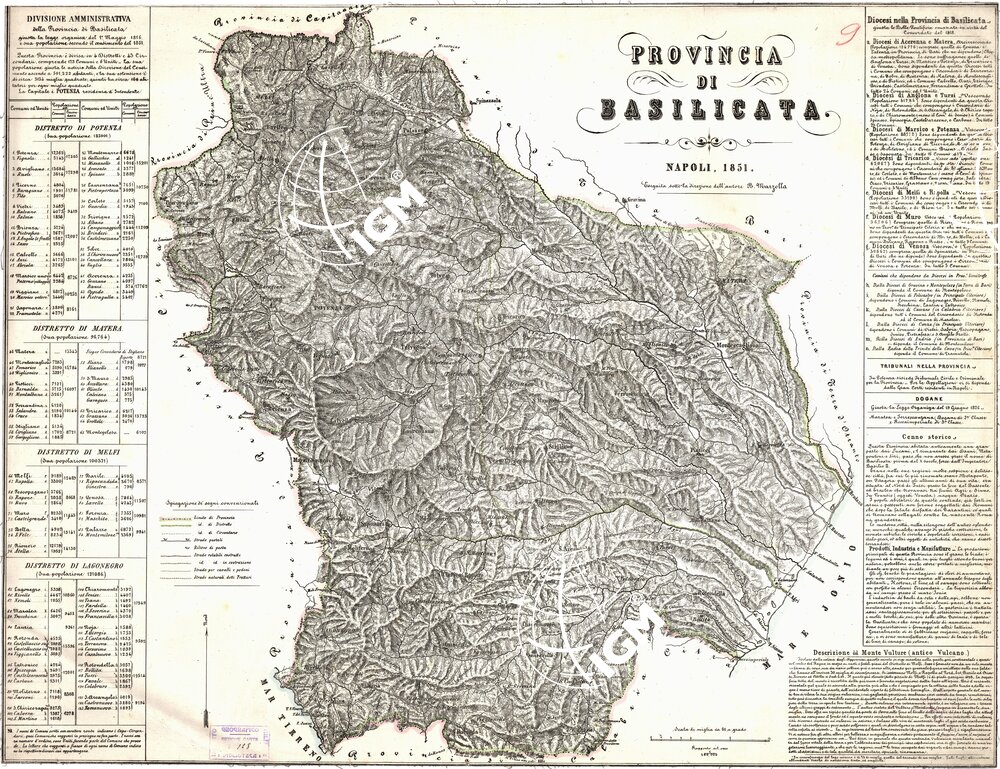 Carta in ventitre fogli montati su tela, stampati a colori in litografia, eseguiti sotto la direzione dell’autore B. Marzolla. Annesso un foglio d’insieme per il Regno delle Due Sicilie alla scala di 1:2.500.000 circa, su cui trovasi scritto: “Atlante geografico di B. Marzolla pubblicandosi ora da L. Manzella, Napoli 1859, nello Stabilimento Geografico”. Le carte distinguono a segni e colori i confini di stato, di provincia, di distretto, di circondario, di comune, le strade regie postali, rotabili, in costruzione, sentieri per cavalli e per pedoni, stazioni di posta, telegrafi. L’orografia è rappresentata col tratteggio a luce obliqua. Ciascun foglio contiene attorno al campo disegnato un quadro statistico-amministrativo, ed ampie notizie storiche e di geografia fisica ed economica: ognuno è distinto da un titolo particolare.