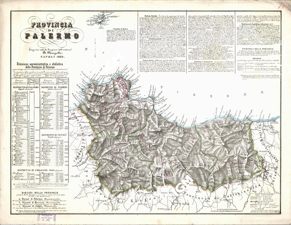 Carta in ventitre fogli montati su tela, stampati a colori in litografia, eseguiti sotto la direzione dell’autore B. Marzolla. Annesso un foglio d’insieme per il Regno delle Due Sicilie alla scala di 1:2.500.000 circa, su cui trovasi scritto: “Atlante geografico di B. Marzolla pubblicandosi ora da L. Manzella, Napoli 1859, nello Stabilimento Geografico”. Le carte distinguono a segni e colori i confini di stato, di provincia, di distretto, di circondario, di comune, le strade regie postali, rotabili, in costruzione, sentieri per cavalli e per pedoni, stazioni di posta, telegrafi. L’orografia è rappresentata col tratteggio a luce obliqua. Ciascun foglio contiene attorno al campo disegnato un quadro statistico-amministrativo, ed ampie notizie storiche e di geografia fisica ed economica: ognuno è distinto da un titolo particolare.