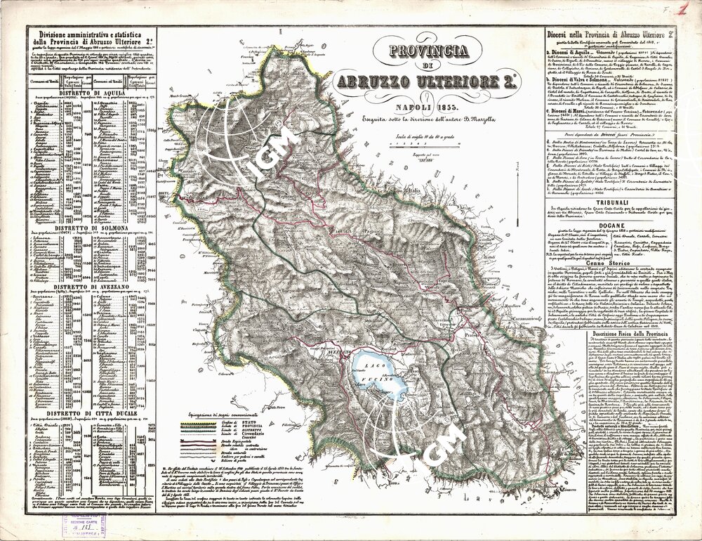 Carta in ventitre fogli montati su tela, stampati a colori in litografia, eseguiti sotto la direzione dell’autore B. Marzolla. Annesso un foglio d’insieme per il Regno delle Due Sicilie alla scala di 1:2.500.000 circa, su cui trovasi scritto: “Atlante geografico di B. Marzolla pubblicandosi ora da L. Manzella, Napoli 1859, nello Stabilimento Geografico”. Le carte distinguono a segni e colori i confini di stato, di provincia, di distretto, di circondario, di comune, le strade regie postali, rotabili, in costruzione, sentieri per cavalli e per pedoni, stazioni di posta, telegrafi. L’orografia è rappresentata col tratteggio a luce obliqua. Ciascun foglio contiene attorno al campo disegnato un quadro statistico-amministrativo, ed ampie notizie storiche e di geografia fisica ed economica: ognuno è distinto da un titolo particolare.