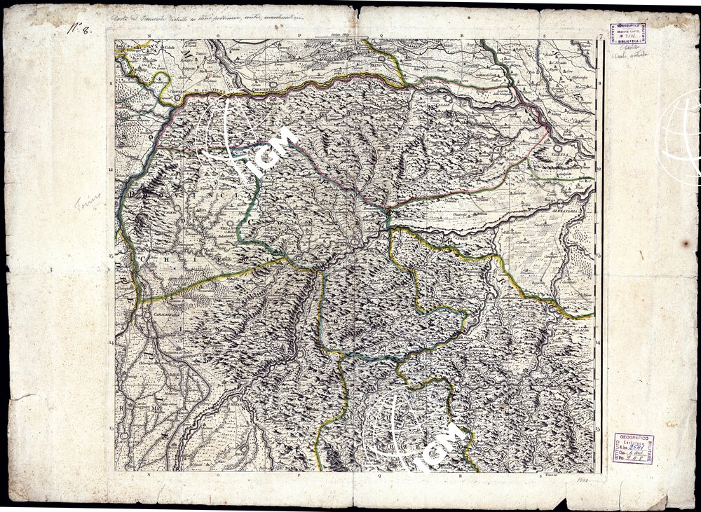 Un foglio senza titolo, tratto da incisione su rame, stampato in nero con confini politici a colori. Mostra l’orografia con il sistema a monticelli. Gli abitati principali sono rappresentati schematicamente in pianta: i secondari con torri e case. E’ tracciata la rete stradale: sono indicate le vegetazioni e le colture. Il territorio rappresentato si estende da oltre il Po a nord (Trino) a oltre Savigliano a sud e da Carignano a ovest ad Alessandria a est.