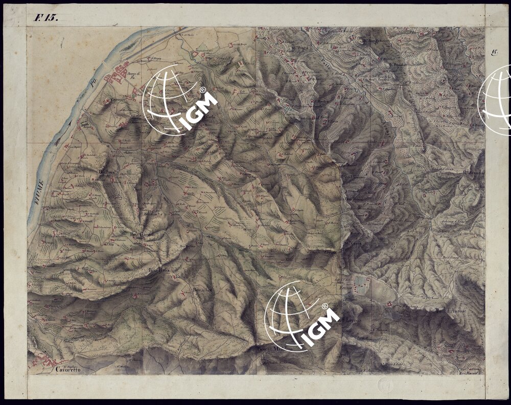 Il titolo non è presente sulla carta. La carta consta di 24 fogli. I primi quattro fogli provengono da ridisegni mentre gli altri venti sono rilievi originali di campagna e sono in parte costituiti da spezzoni riuniti. Orografia acquerellata a luce obliqua. Qualche foglio reca la firma dei tenenti Salius, Ricci e Morozzo.