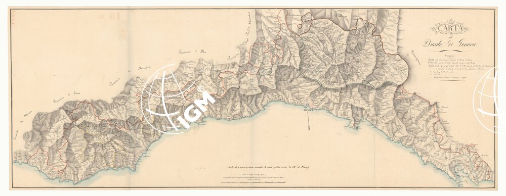 Disegno ad acquerello nitido ed accurato. L’orografia è rappresentata mediante lo sfumo a luce obliqua. Le acque sono colorate in azzurro, gli abitati in rosso, i confini a varie tinte, le strade in nero. In alto a destra la leggenda dei segni convenzionali.