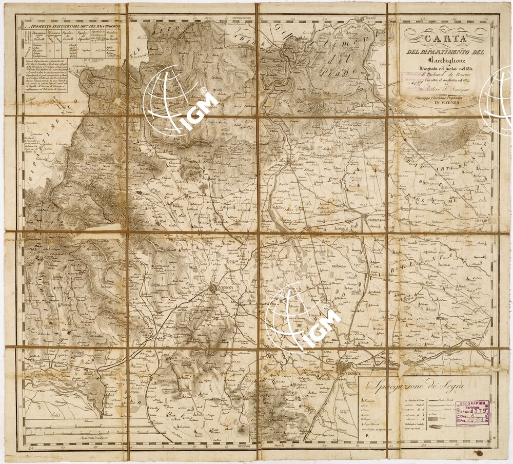 Foglio unico montato su tela a stacchi. Rappresentazione orografica a tratteggio. In basso: a destra, laspiegazione dei segni; a sinistra due scale grafiche, in kilometri ed in miglia d’Italia di 60 al grado. In alto a sinistra recasi il prespetto statistico del dipartimento del Bacchiglione.