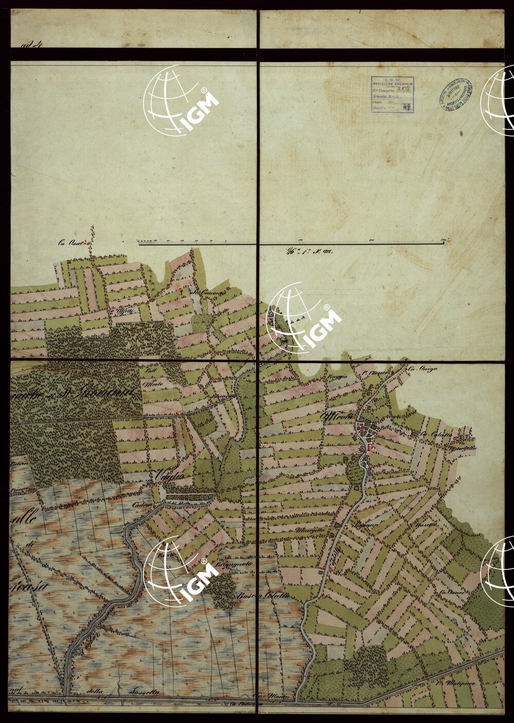 Copia della carta del Denaix eseguita dal 1800 al 1808 alla scala di 1:18.000 in trenta fogli. Il disegno fu eseguito nel 1836 la riduzione nel 1837 a spesa del Genio terrestre austriaco. Consta di trenta fogli ad acquarello montati su tela. Colori usati: azzurro per l’idrografia, rosso per gli abitati e le strade principali, verde per le coltivazioni. Il foglio 1 contiene il quadro di unione. I fogli 9 e 10 recano il titolo; il foglio 20 contiene notizie sulla costruzione della carta: il foglio 25 la rosa dei venti; il foglio 30 notizie sulla laguna. Annessi alla carta sono un piano del Forte di S.Pietro pure ad acquarello alla scala di 1:2.500 e una carta dei “sondaggi lungo la costa tra il Forte Alberone e la Batteria Quattro Fontane” firmata “Salis Soglio maggio 1847”.