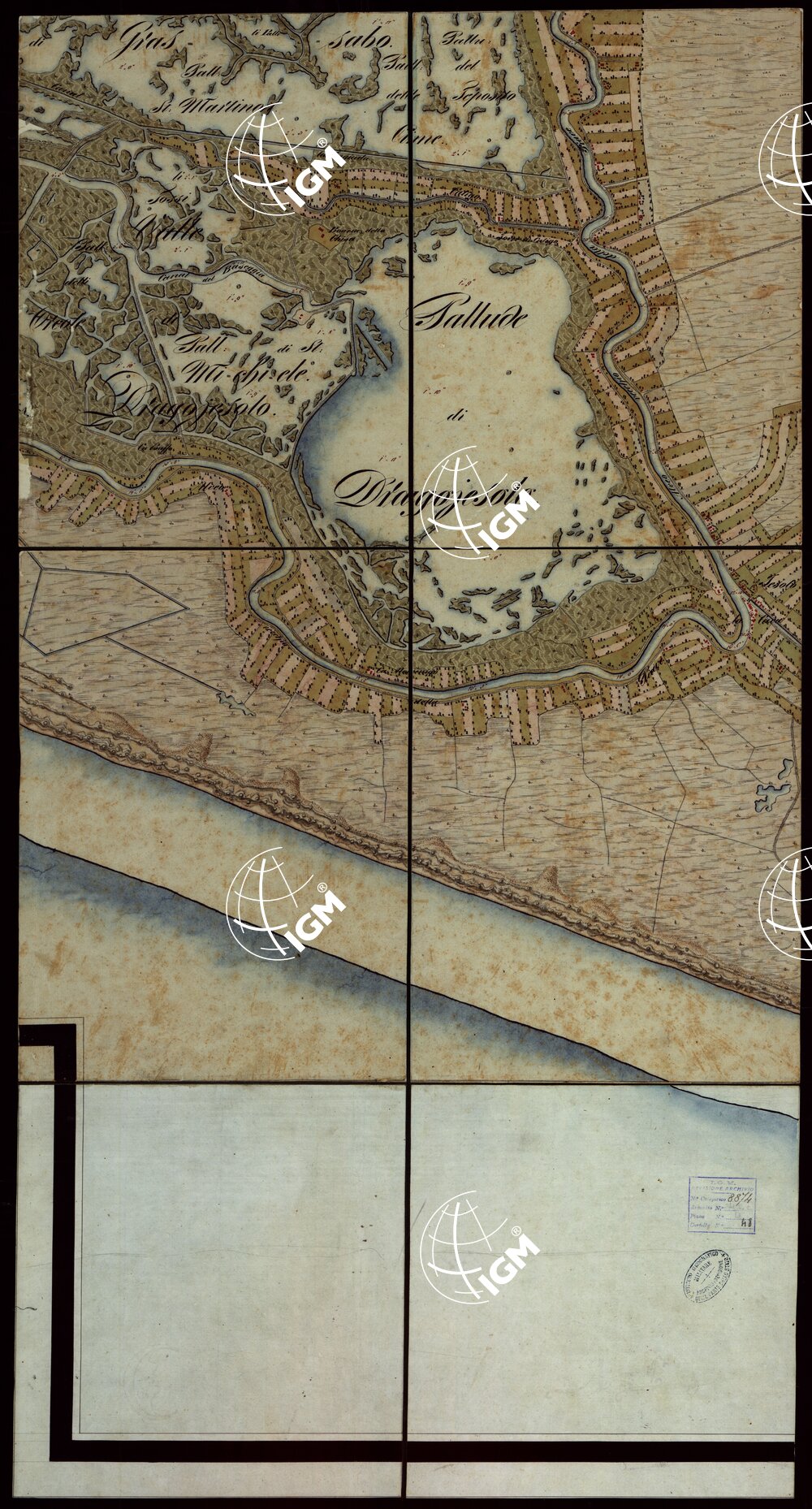Copia della carta del Denaix eseguita dal 1800 al 1808 alla scala di 1:18.000 in trenta fogli. Il disegno fu eseguito nel 1836 la riduzione nel 1837 a spesa del Genio terrestre austriaco. Consta di trenta fogli ad acquarello montati su tela. Colori usati: azzurro per l’idrografia, rosso per gli abitati e le strade principali, verde per le coltivazioni. Il foglio 1 contiene il quadro di unione. I fogli 9 e 10 recano il titolo; il foglio 20 contiene notizie sulla costruzione della carta: il foglio 25 la rosa dei venti; il foglio 30 notizie sulla laguna. Annessi alla carta sono un piano del Forte di S.Pietro pure ad acquarello alla scala di 1:2.500 e una carta dei “sondaggi lungo la costa tra il Forte Alberone e la Batteria Quattro Fontane” firmata “Salis Soglio maggio 1847”.
